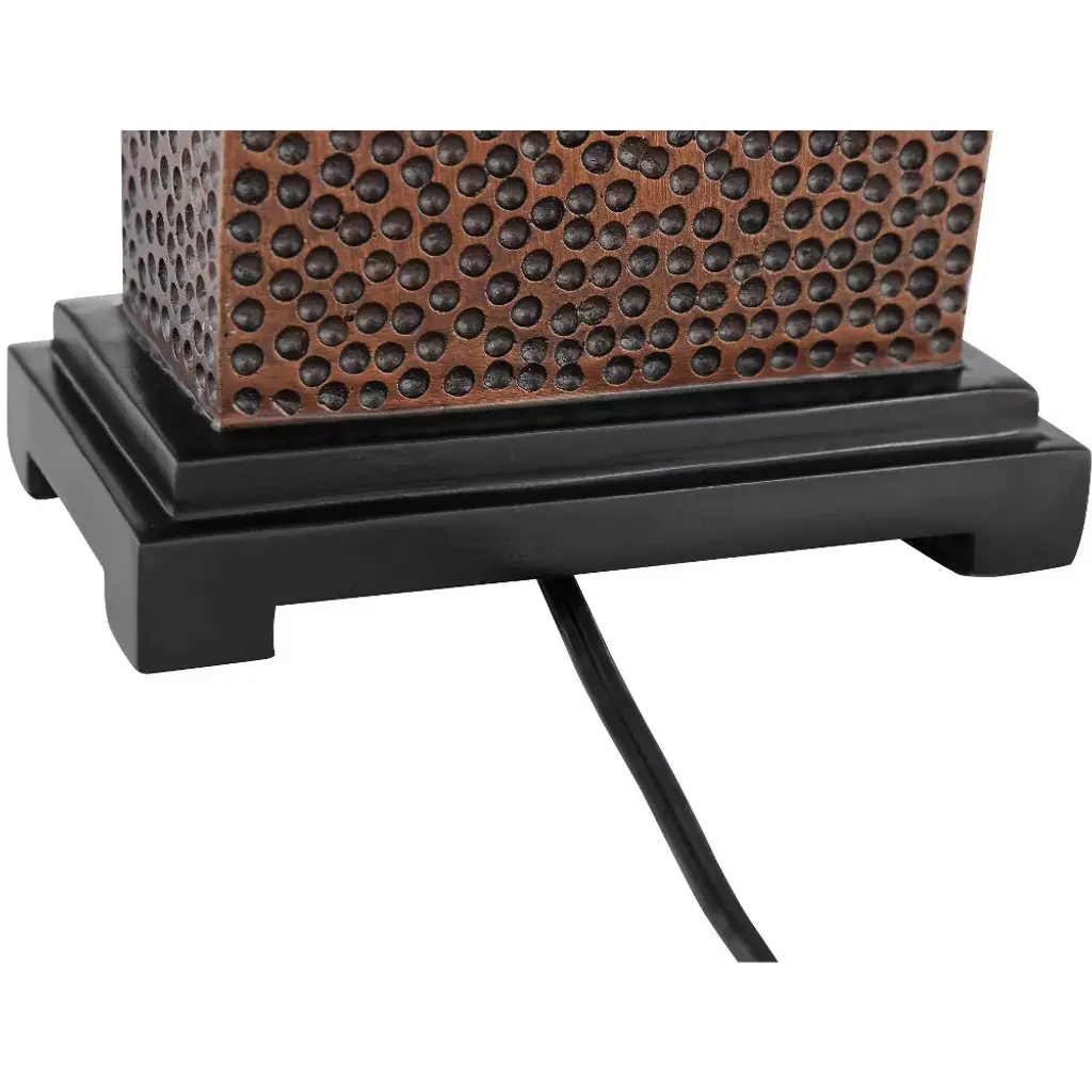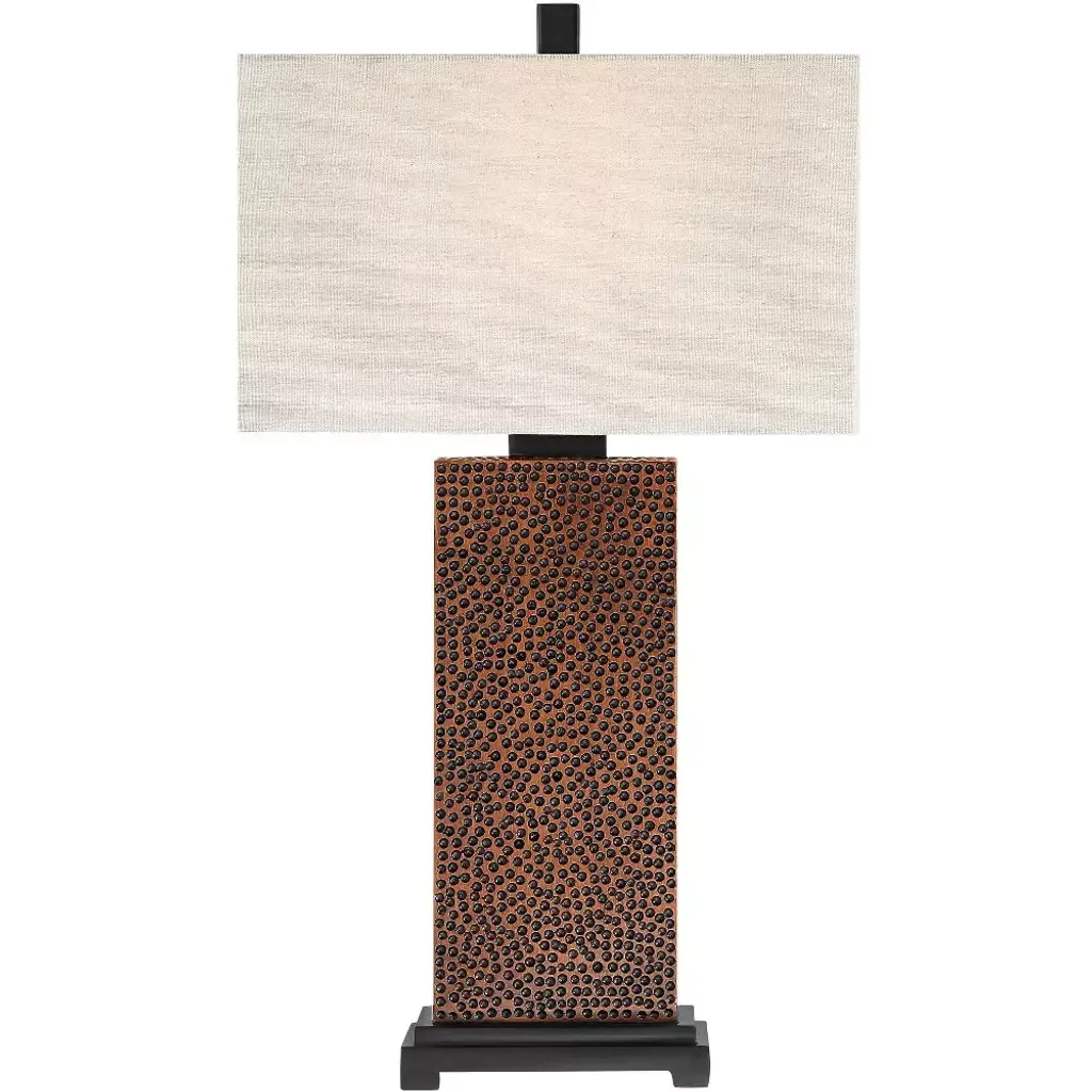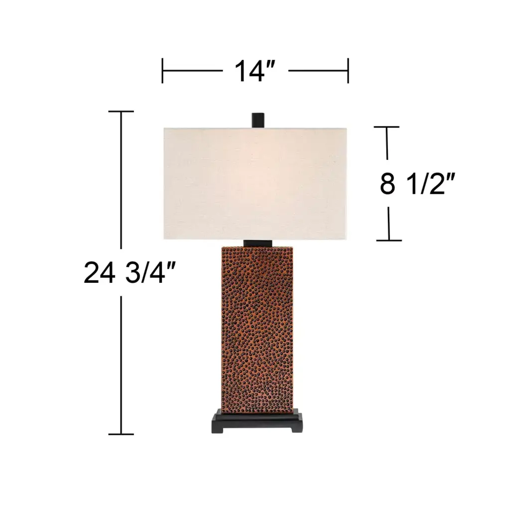 In a stylish set of two, these rectangular column lamps come from the 360 Lighting brand, and offer a great look for modern farmhouse or contemporary decorating. Each lamp features a base crafted to look like textured, hammered metal in a bronze finish. Up top are rectangular fabric shades.