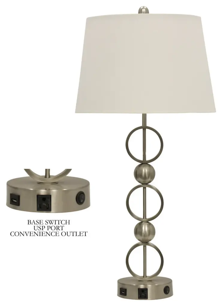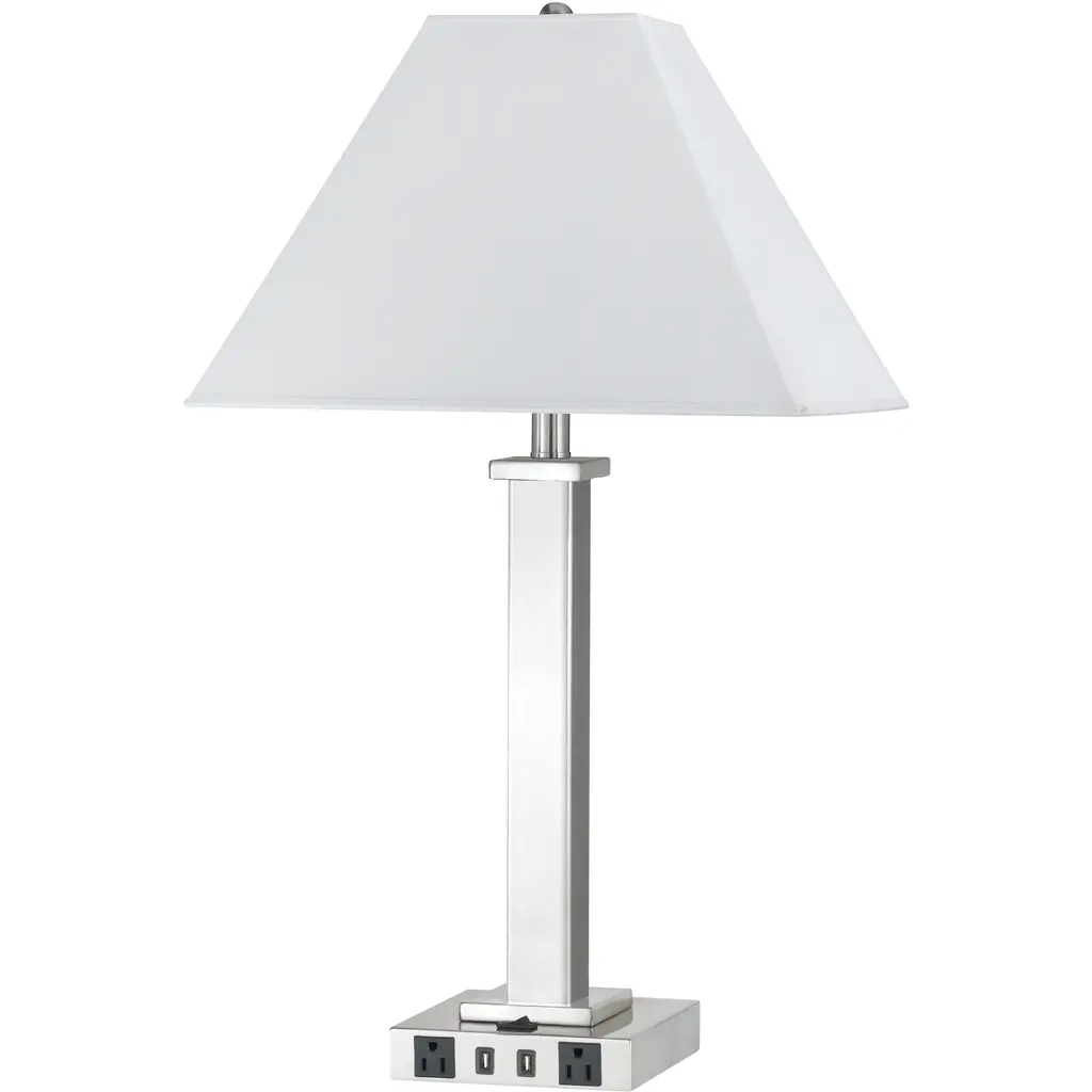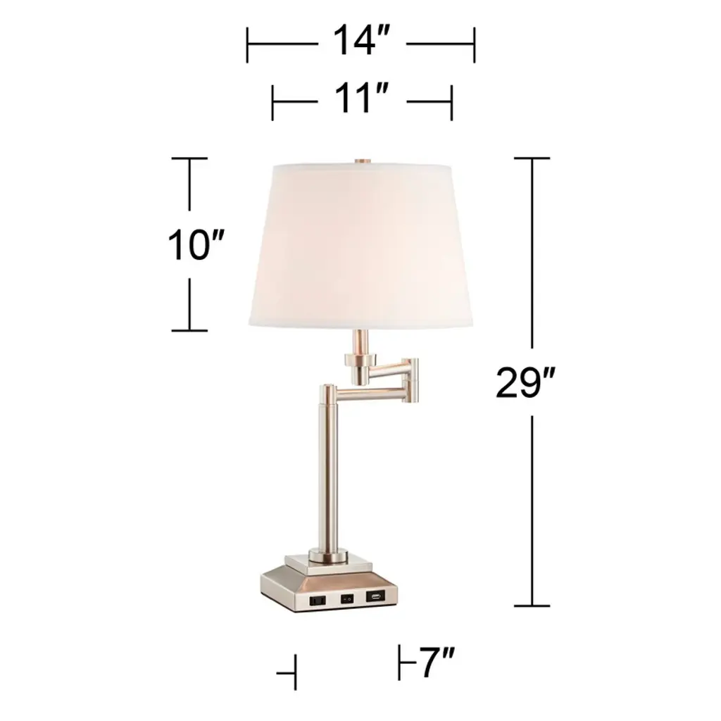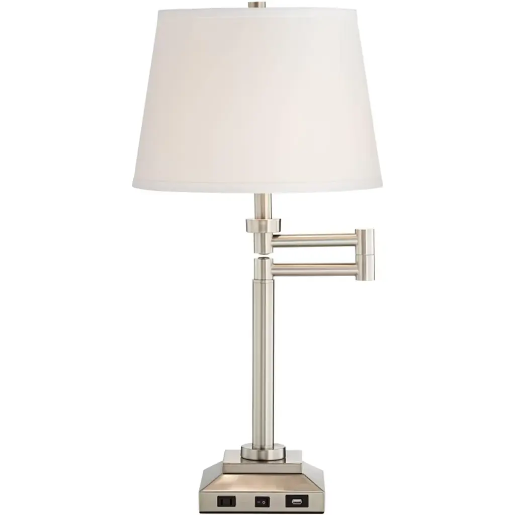 This swing arm desk lamp makes the perfect work companion. Two bulbs provide bright and even lighting for reading, drawing, or other tasks. In the lamp base is a built-in 120 volt electrical outlet and a USB port so you can recharge mobile phones or other electronic devices. Lamp pole and base are in a brushed nickel finish. Top shade is in a white linen fabric.