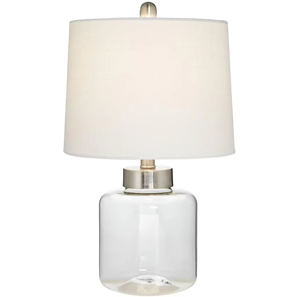 This fillable glass accent lamp allows you to easily update your decor on a whim. The clear glass body can be filled with keepsake items, collectibles, or other decorative pieces for a truly unique accent lamp. A light linen drum shade up top lends itself to any collectible you put in the base, and it also creates a pleasing glow in the room. Easy on-off switch for operation.