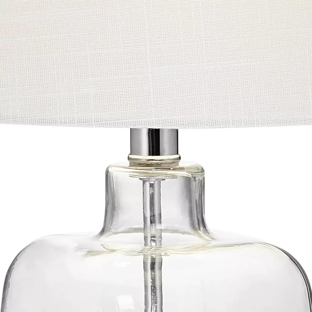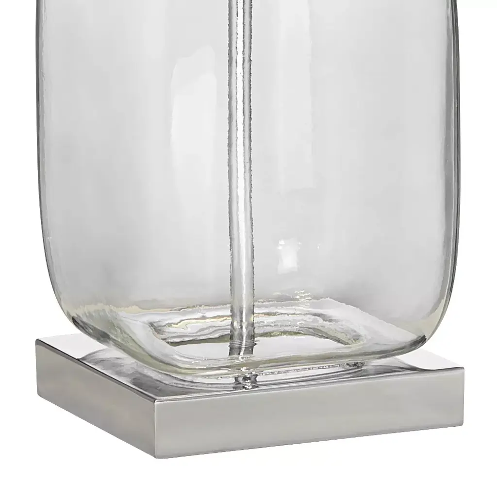 This fillable glass table lamp set allows you to easily update your decor on a whim. The clear square glass body can be filled with small keepsake items, collectibles, or other lightweight decorative pieces for a truly unique decor accent. A light drum shade up top of each lamp lends itself to any collectible you put in the base, and it also creates a pleasing glow in the room. Easy on-off switch for operation.
