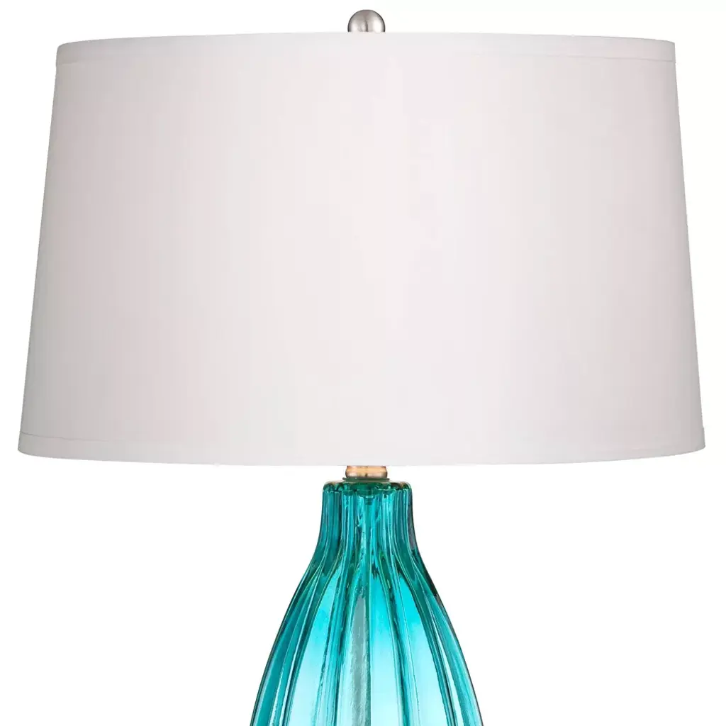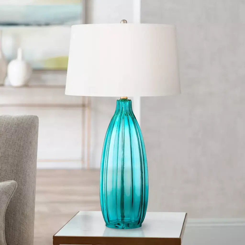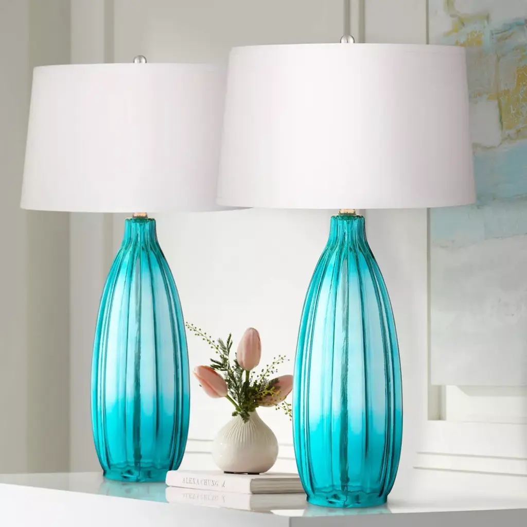 This set of two ultra-chic glass table lamps features a classic design in a sleek fluted motif. A bright pop of blue in the shade complements the modern look. A white drum lamp shade completes the look.
