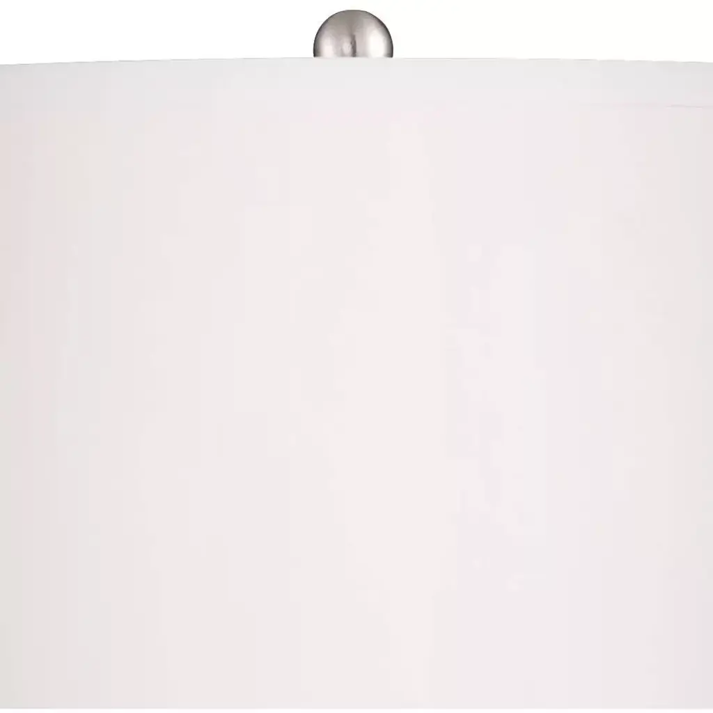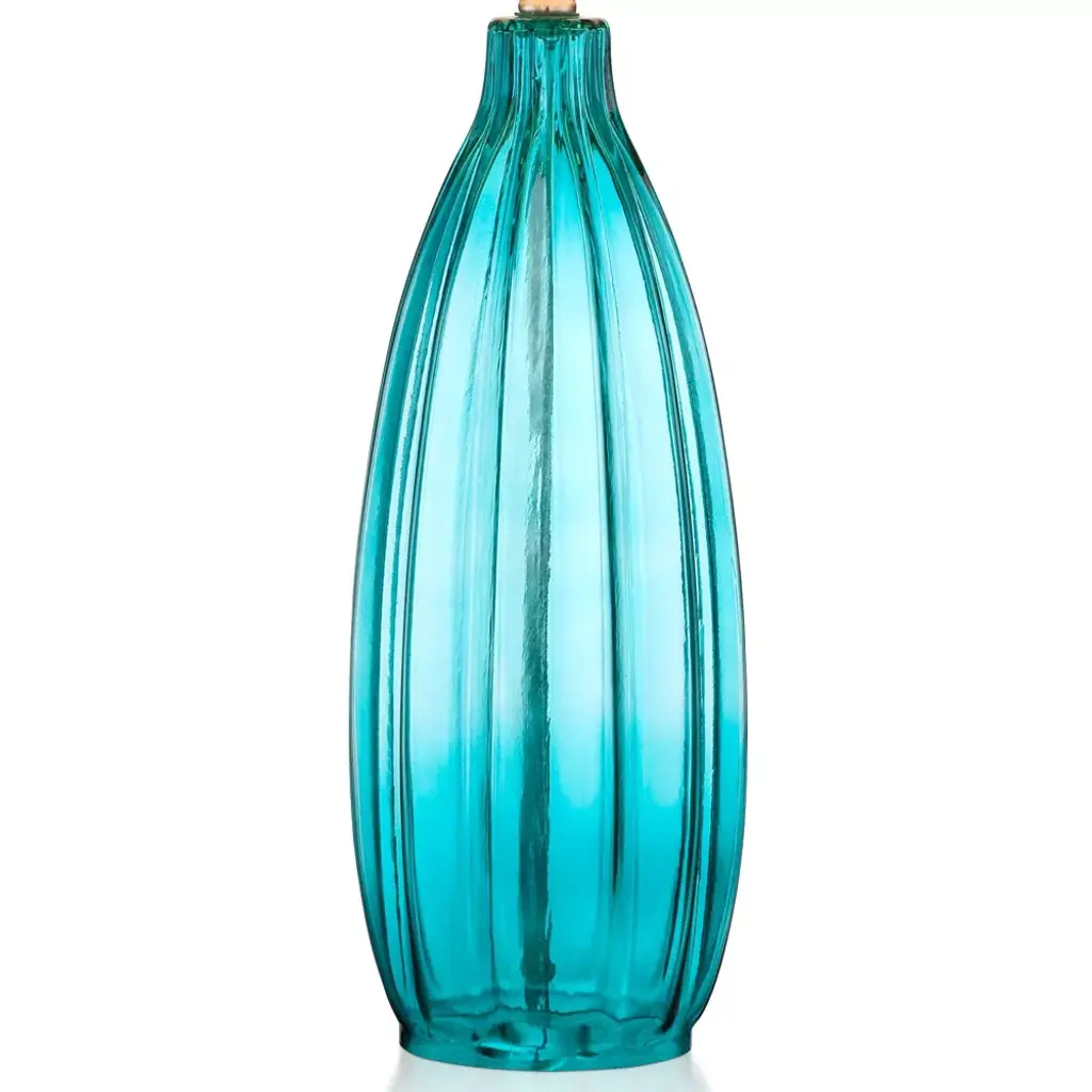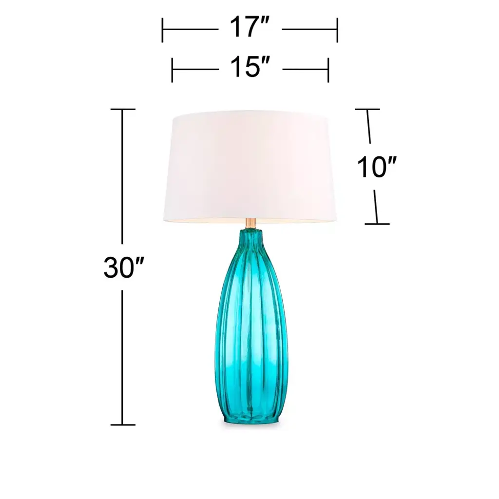 This set of two ultra-chic glass table lamps features a classic design in a sleek fluted motif. A bright pop of blue in the shade complements the modern look. A white drum lamp shade completes the look.