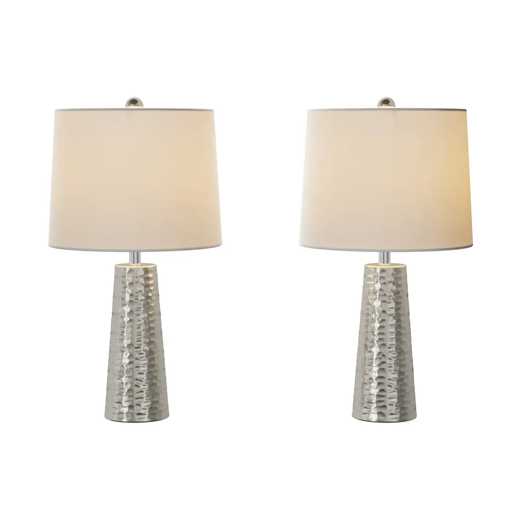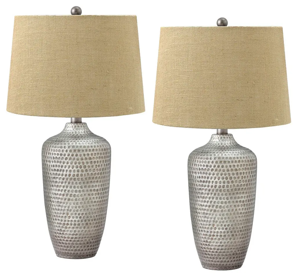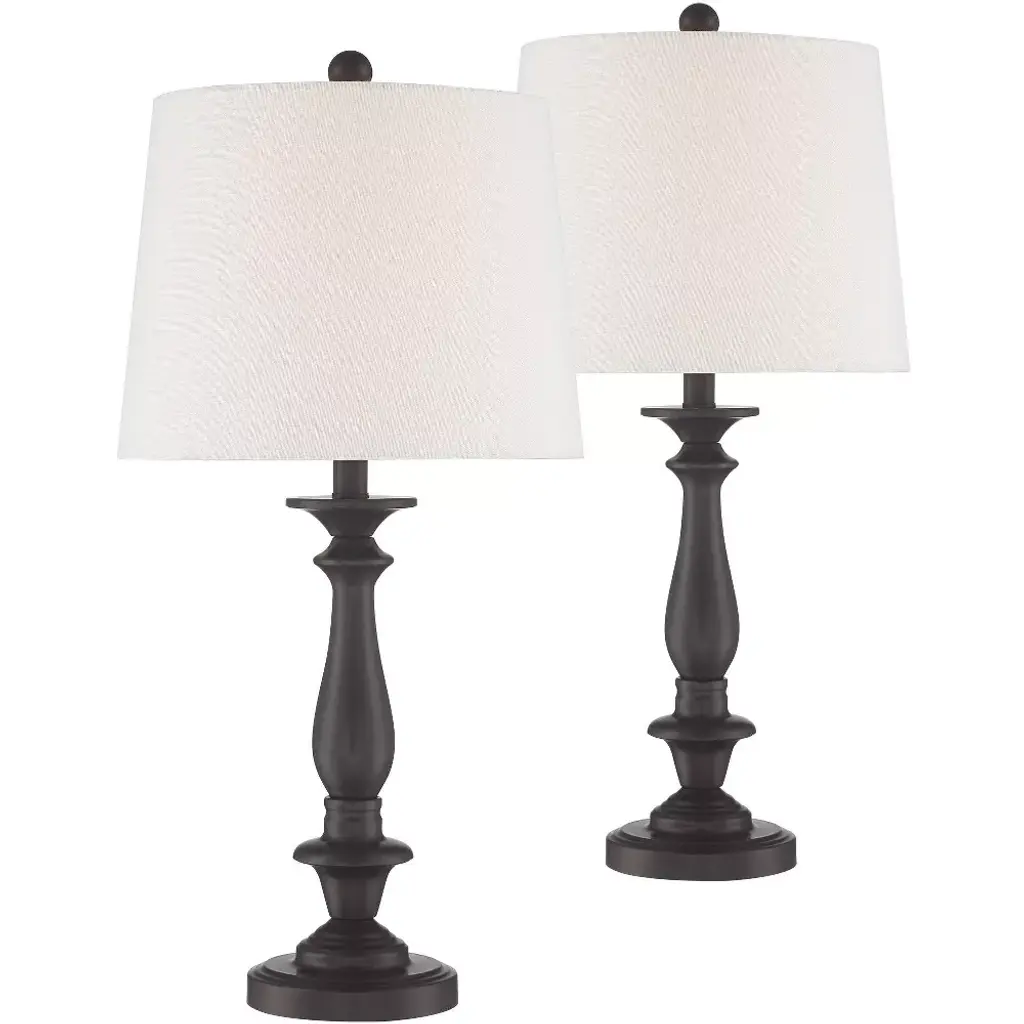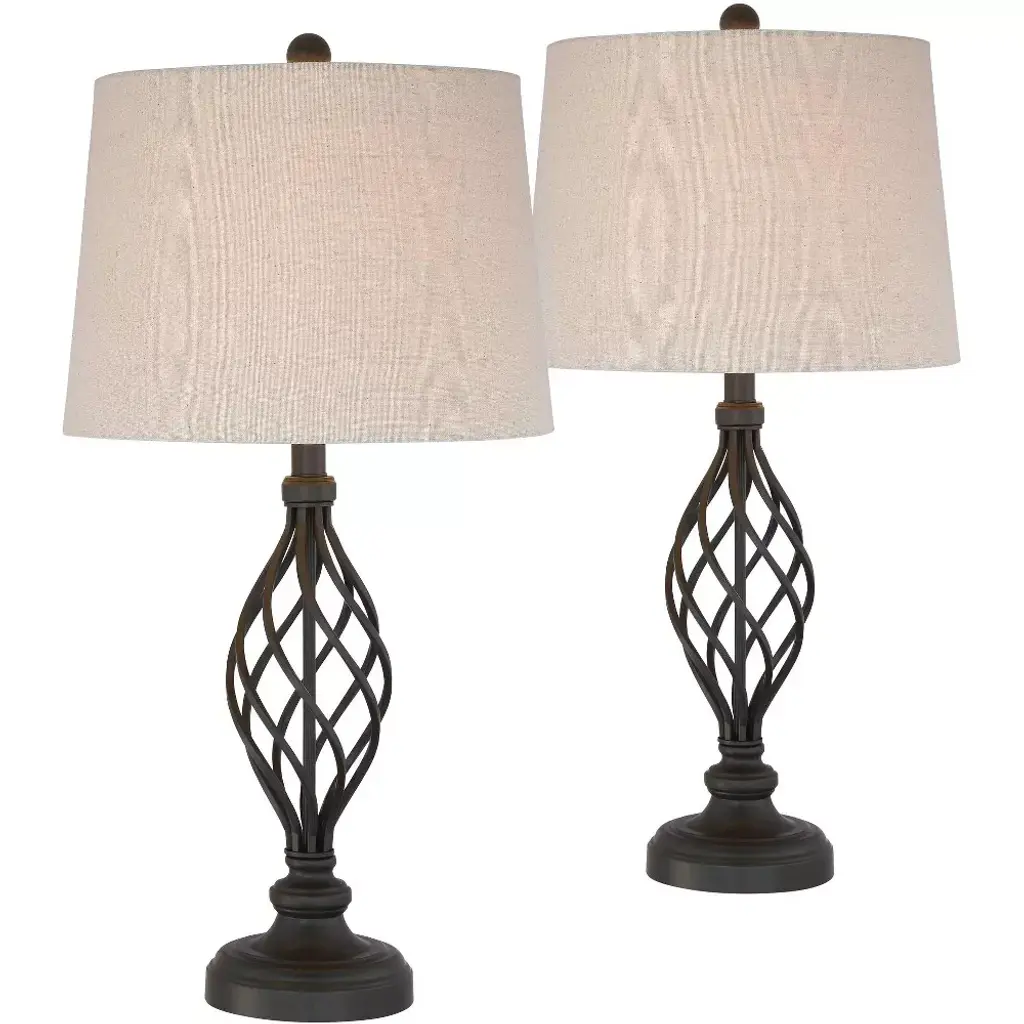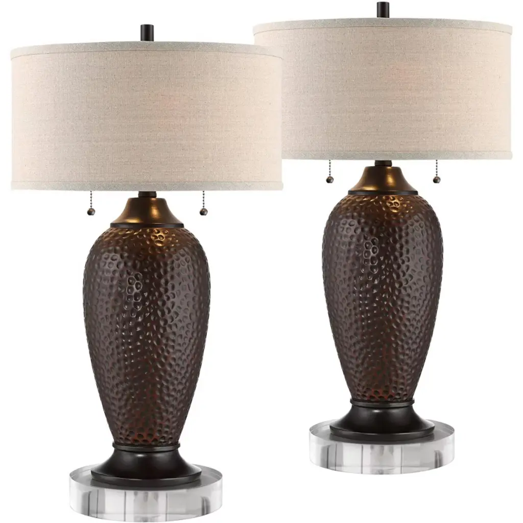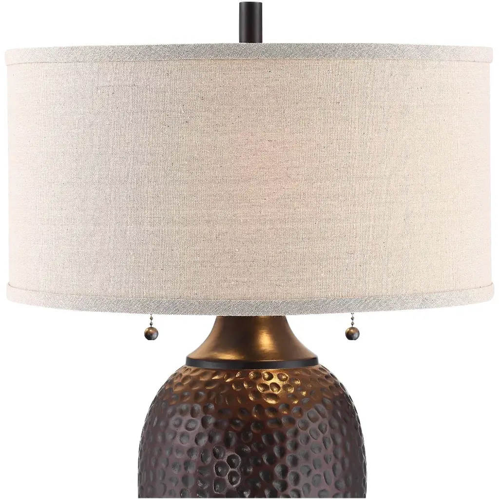 In a convenient set of two, each of these contemporary industrial table lamps features a hammered resin body with a rich, textured feel. An oiled bronze finish adds a warm, beautiful effect. These lamps are then topped by oatmeal linen drum shades, which only reinforce the look and feel of the overall design. Brimming with vintage character, they're sure to enhance any room.