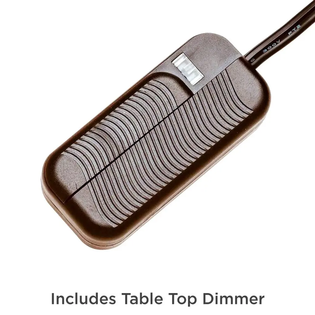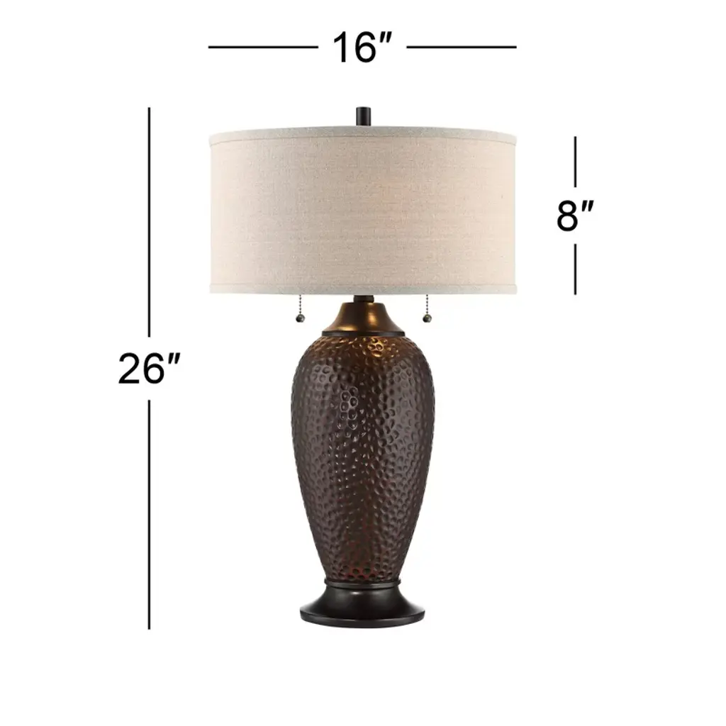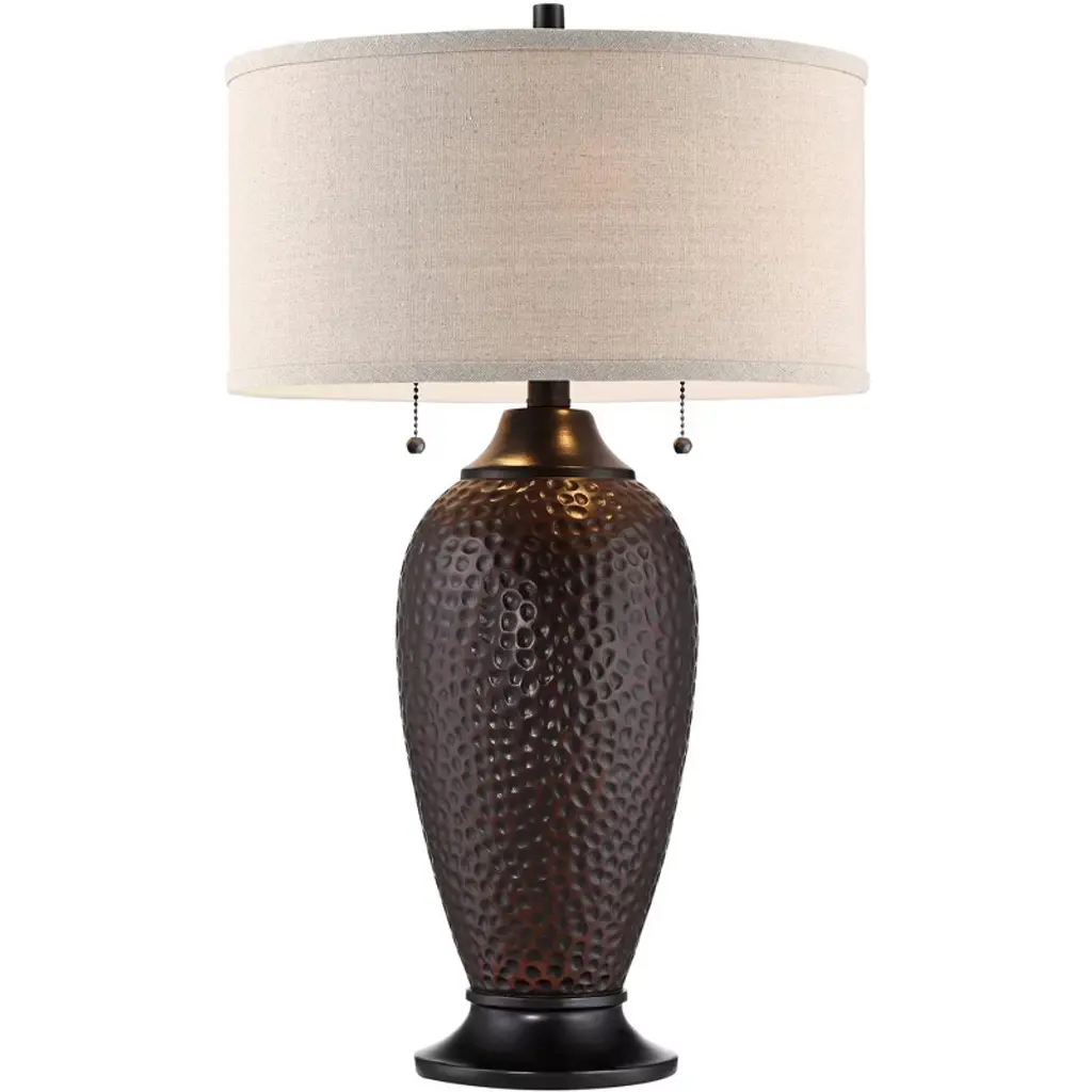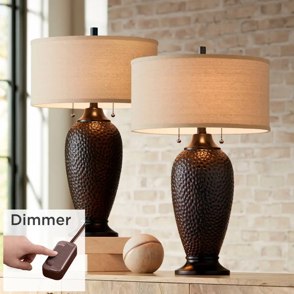 In a convenient set of two, each of these contemporary industrial table lamps comes in a hammered resin body with a rich textured feel. An oiled bronze finish adds warm, beautiful effect. These lamps are then topped by oatmeal linen drum shades, which only reinforce the look and feel of the overall design. Brimming with vintage character, they're sure to enhance any room. This lamp set comes with two tabletop dimmers, one for each lamp, which allows you to control the level of lighting. Simply insert the lamp plug into the dimmer outlet, and then slide the switch on the control to dim or brighten the lighting.