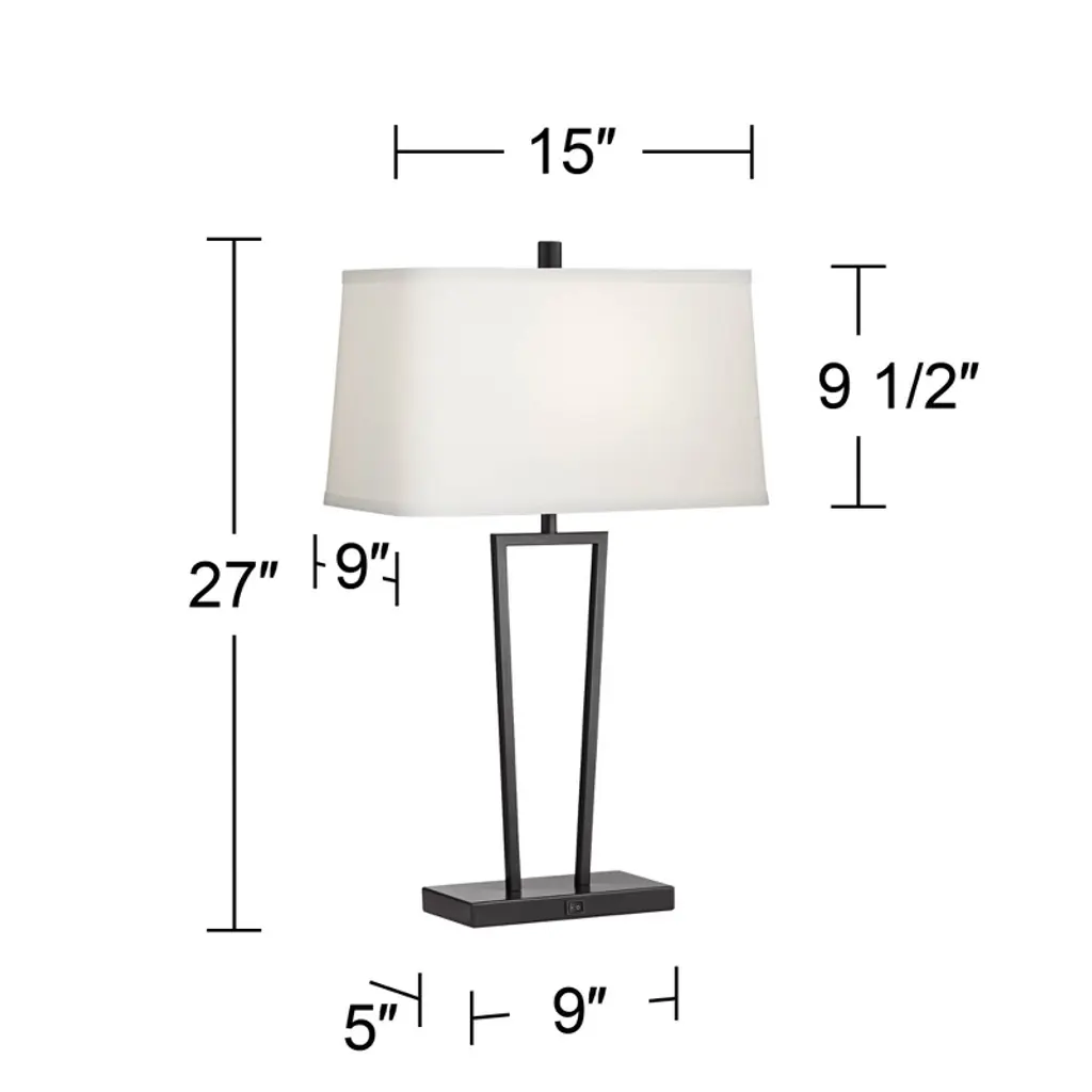 Elegantly modern, these contemporary table lamps are a superb choice for side tables or nightstands. Black finish metal creates a bold look while thin, angular supports ensure a light look and feel. The design is then topped with a square shade to complete its angular appeal. Each lamp has a USB port built into the base, perfect for charging handheld electronics.