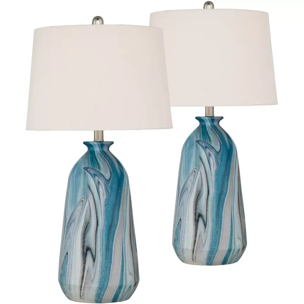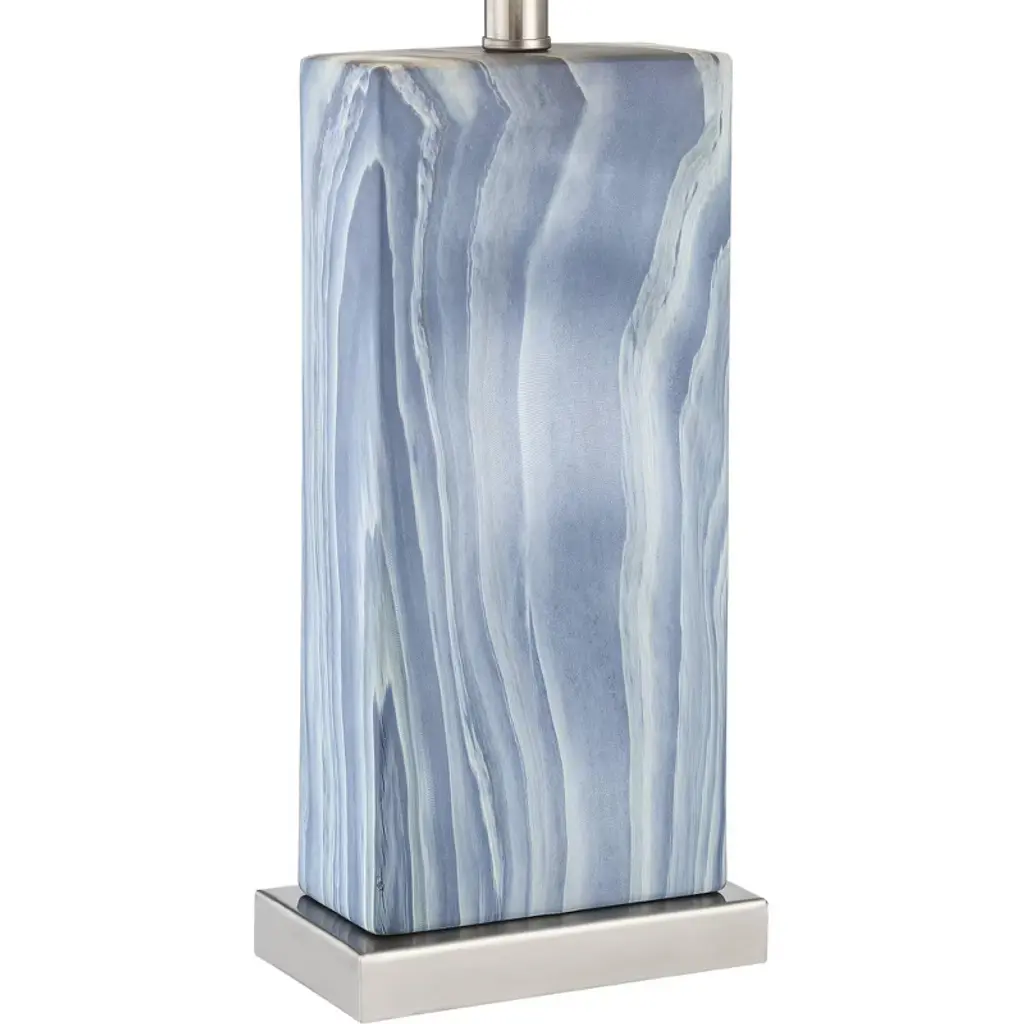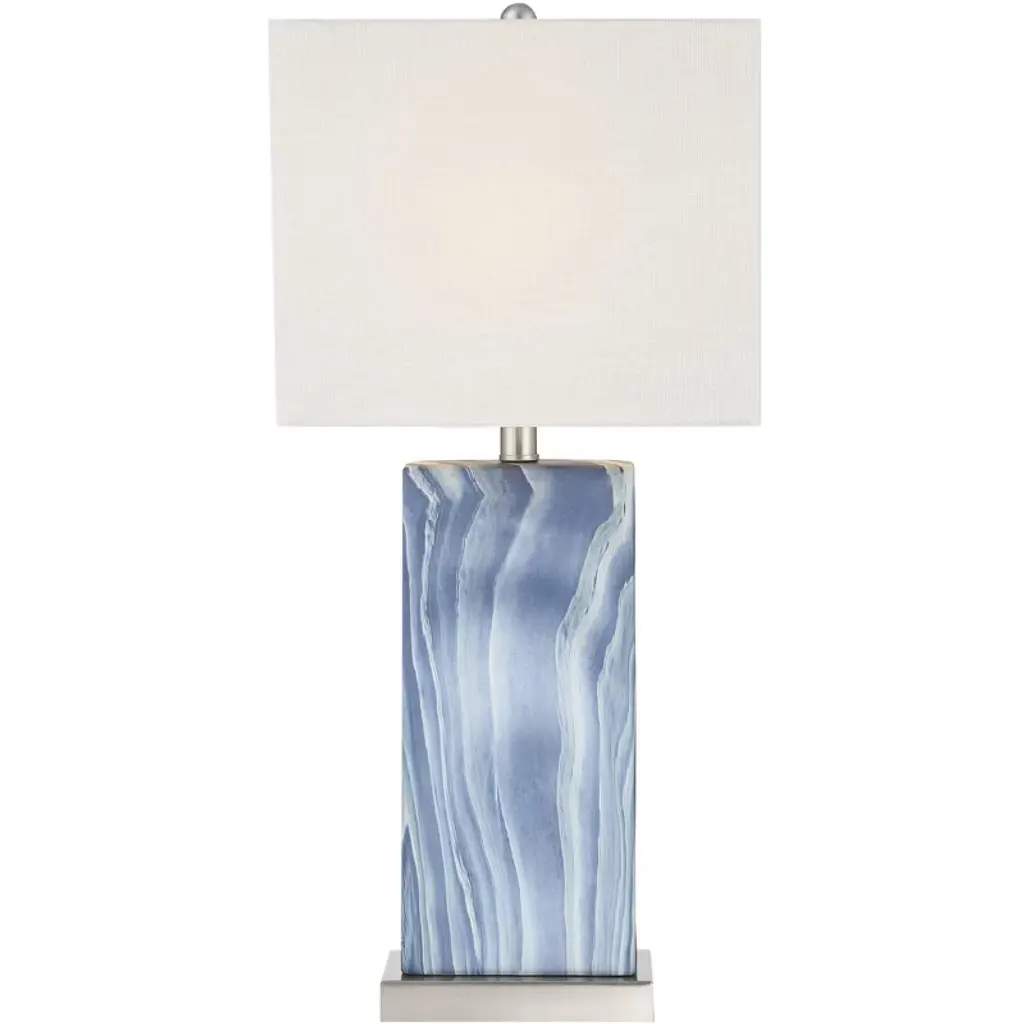 Get this serene set of two for a living room or bedroom area. Each of these contemporary table lamps comes in a blue finish, topped with a rectangular white fabric shade for a complementary effect. A USB port is built into the bottom of the base, allowing for smartphone and device charging. Not only do these blue table lamps provide a lovely decorative effect, but they're also a great convenience for a modern home.