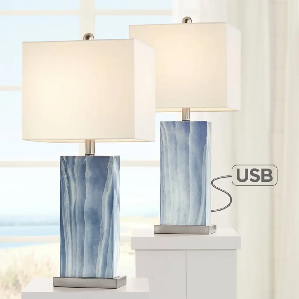 360 Lighting Connie Modern Table Lamps 25" High Set Of 2 Blue Faux Marble With Usb Charging Port White Rectangular Shade For Living Room Office Desk