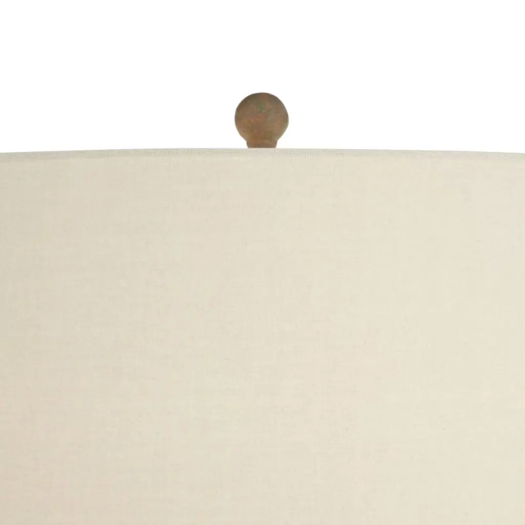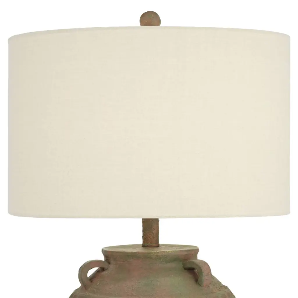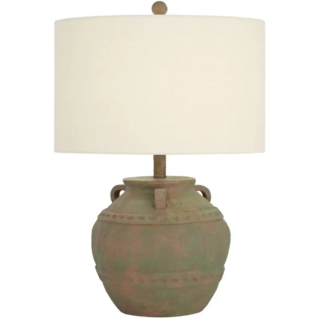 Brighten your home with this handsome lamp design from the 360 Lighting brand. The design features a rustic jar-profile base that comes in a decorative, distressed musk green finish. The jar detailing is a wonderful look for both rustic lodge and traditional room decor. Up top is a white fabric drum shade.