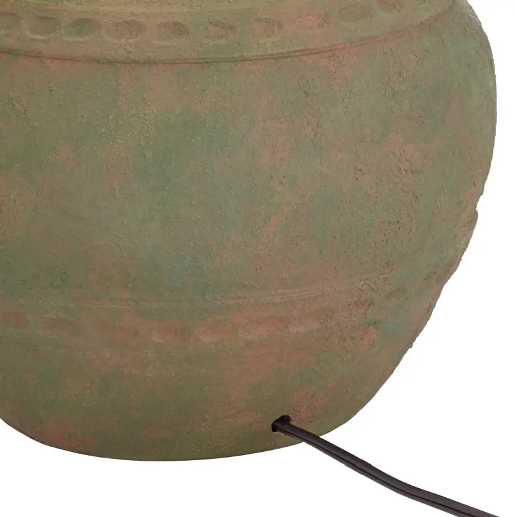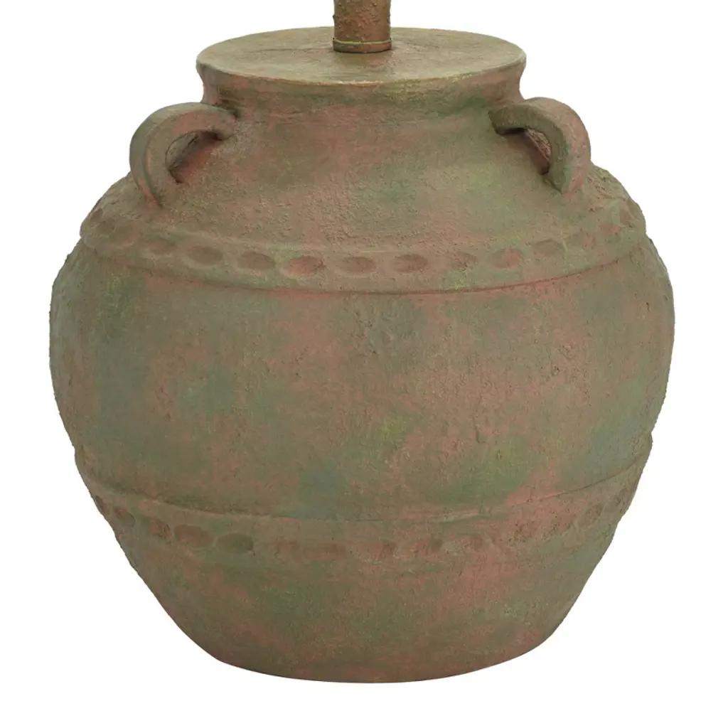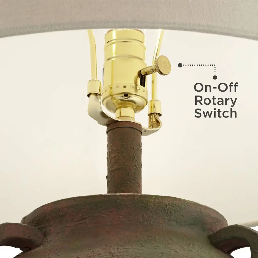 Brighten your home with this handsome lamp design from the 360 Lighting brand. The design features a rustic jar-profile base that comes in a decorative, distressed musk green finish. The jar detailing is a wonderful look for both rustic lodge and traditional room decor. Up top is a white fabric drum shade.