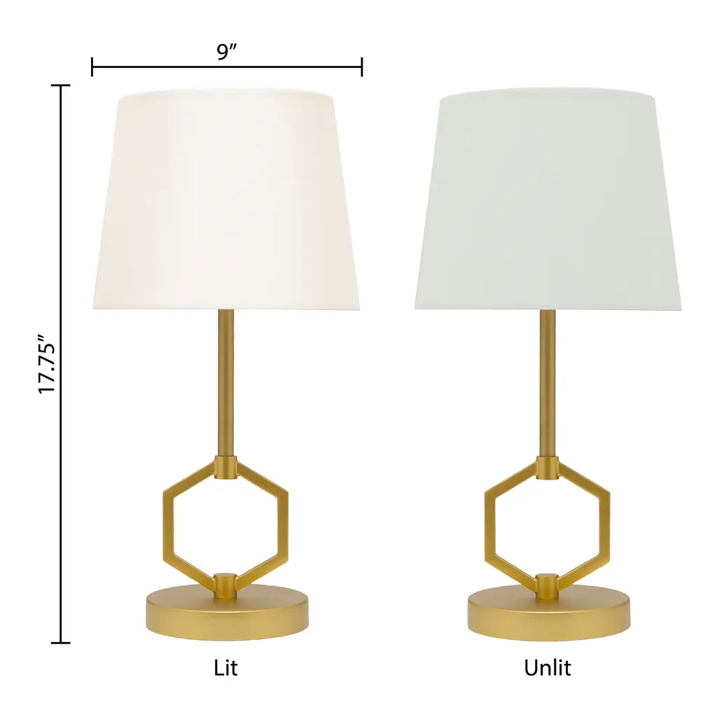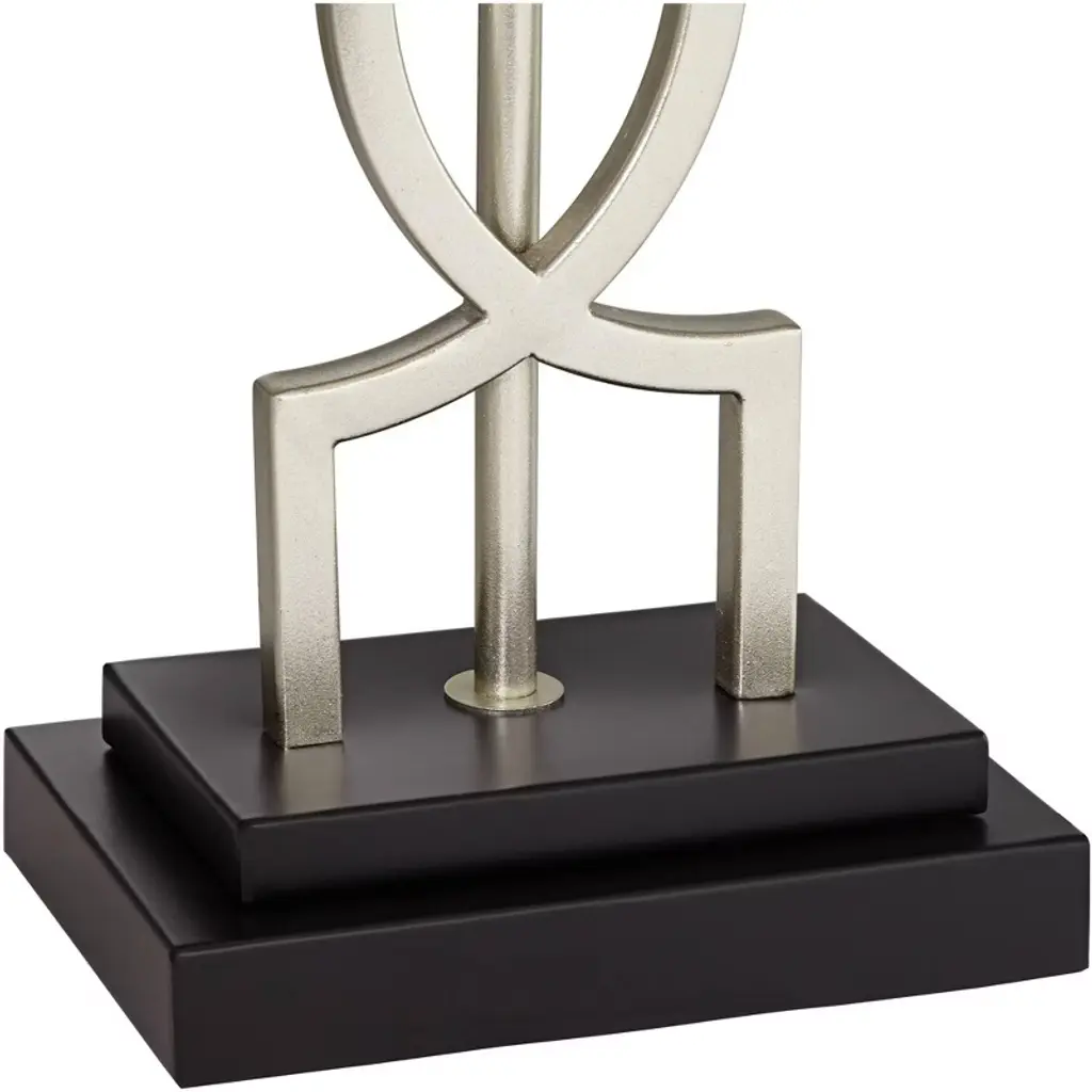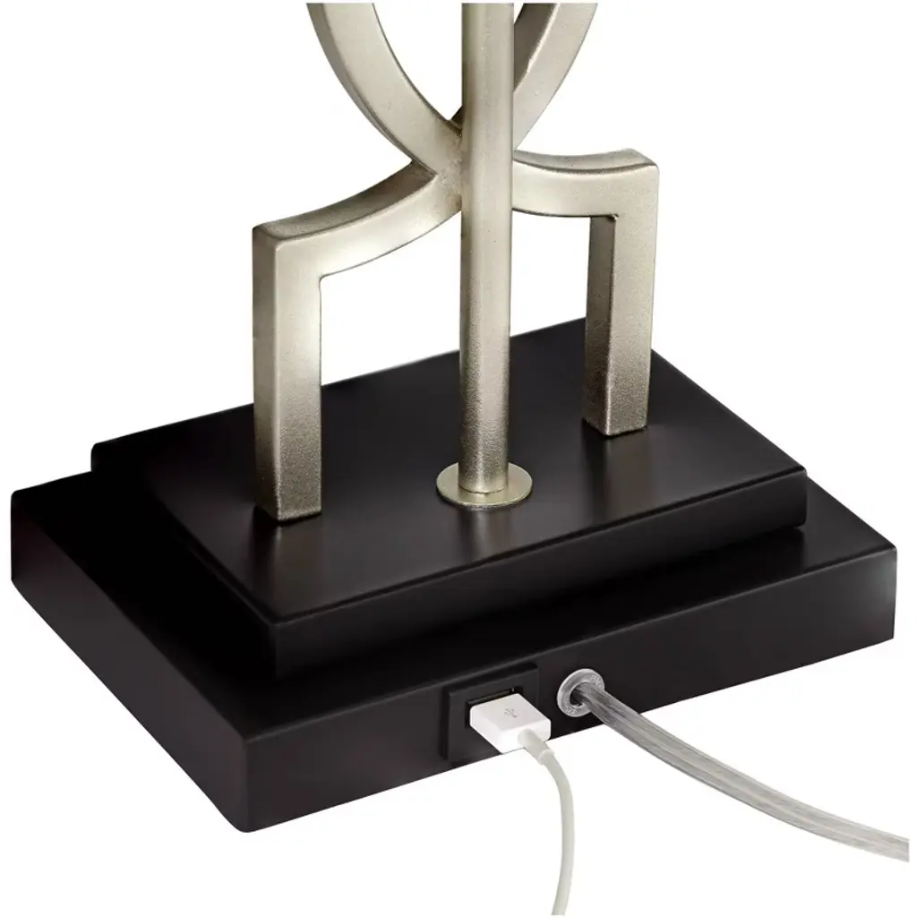 With abstract-shaped bases in a brushed nickel finish and curved rectangular shades, these modern table lamps make bold statement pieces. Each design sits on top of a black marble pedestal. Each lamp has an integrated USB port for easy charging of your devices. The USB ports work with the light turned off and are meant for use with smartphones.