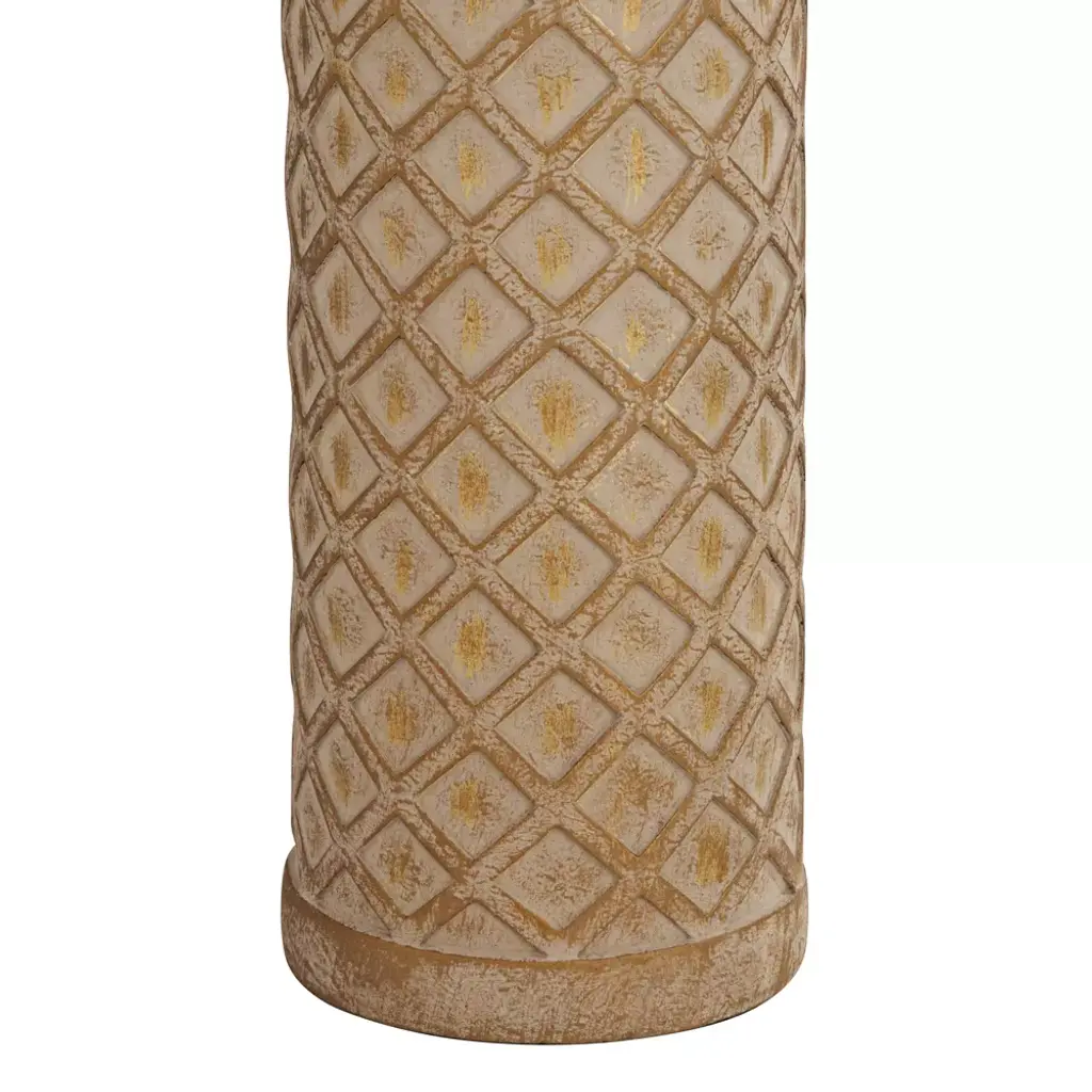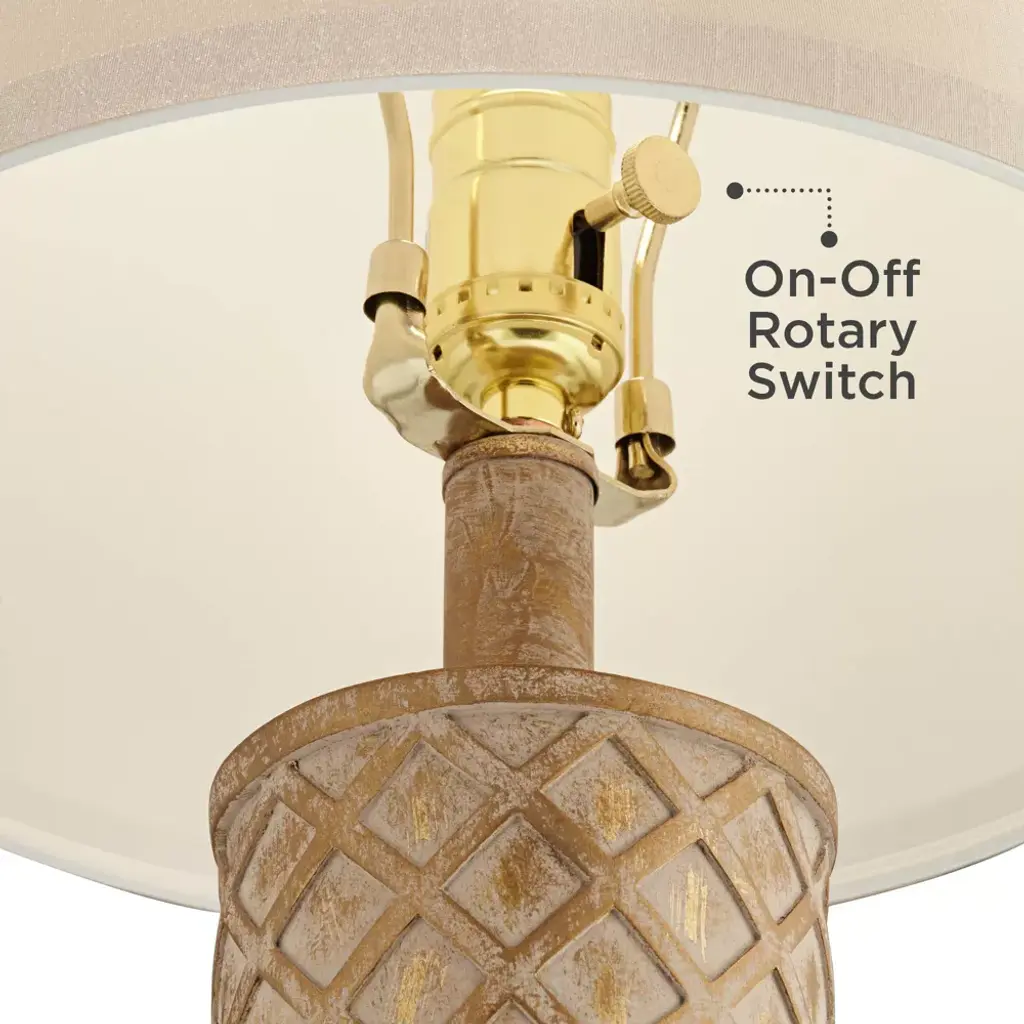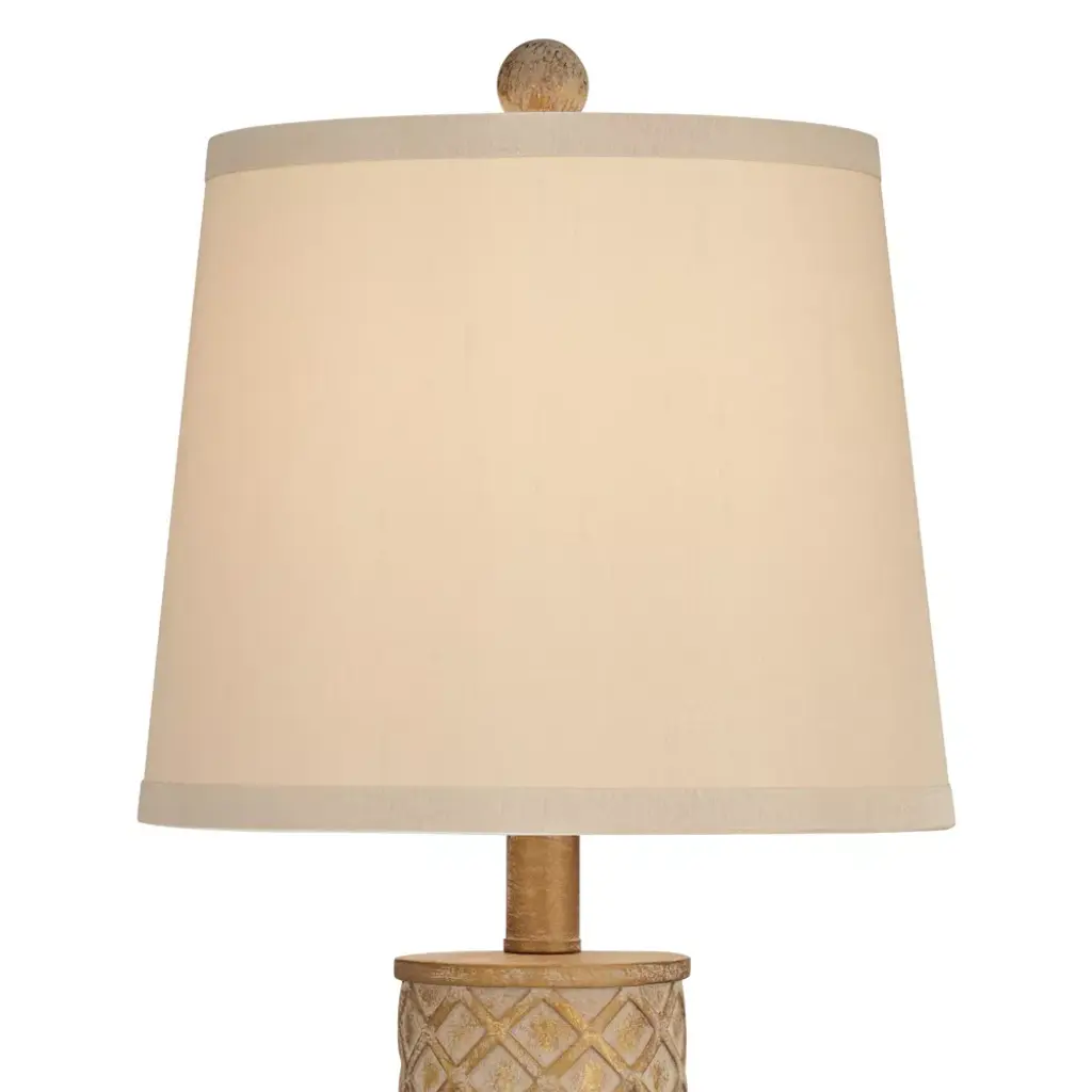The lovely lattice detail in the lamp body is adorned with a gold wash finish that allows for a faux distressed look in this column table lamp set. The elegant look is topped with a light-colored lamp shade. With an on-off switch on the socket to complete the look. From the 360 Lighting collection of table lamps.