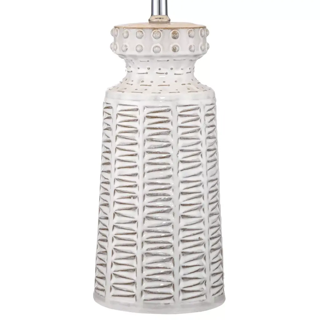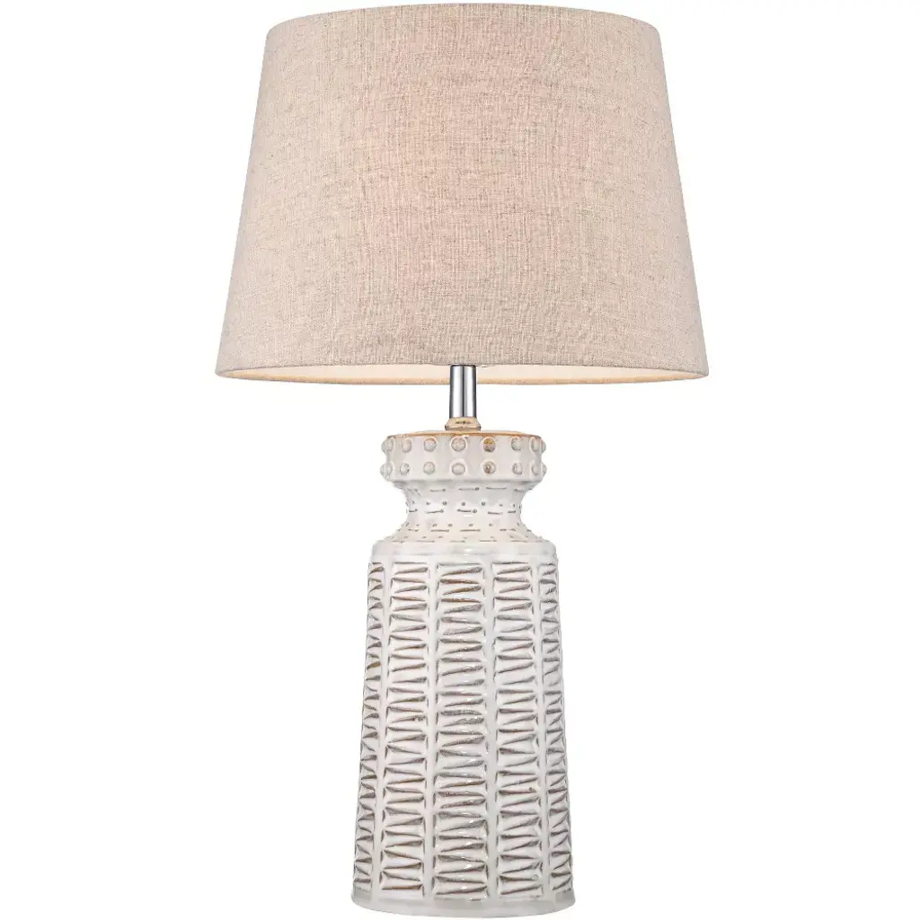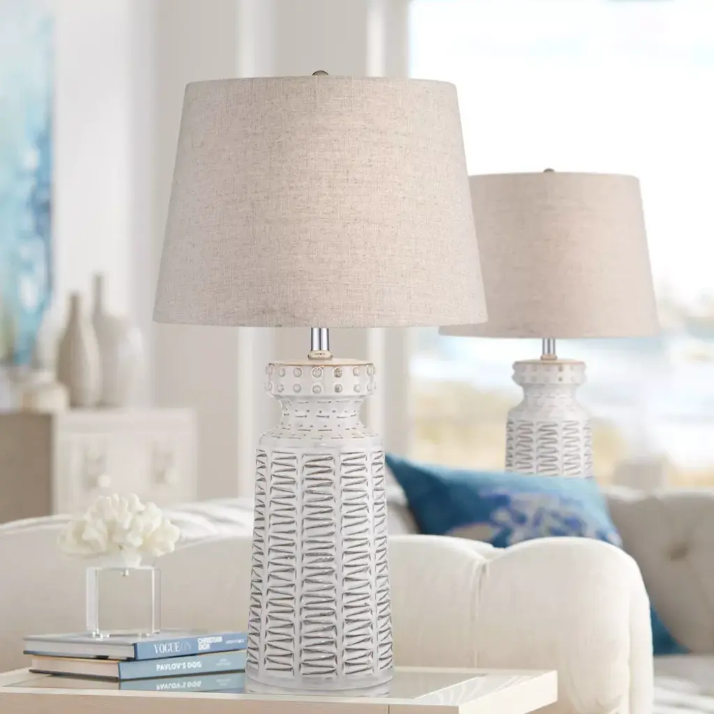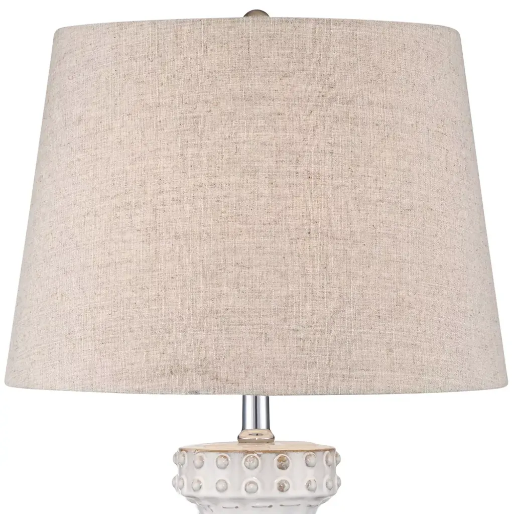Inspired by the soft elegance of a cottage along the coast, this set of two distressed white ceramic table lamps adds a touch of sophistication to any area. Made of ceramic and finished in white for a chic, charming look and feel. Topped with a linen shade.
