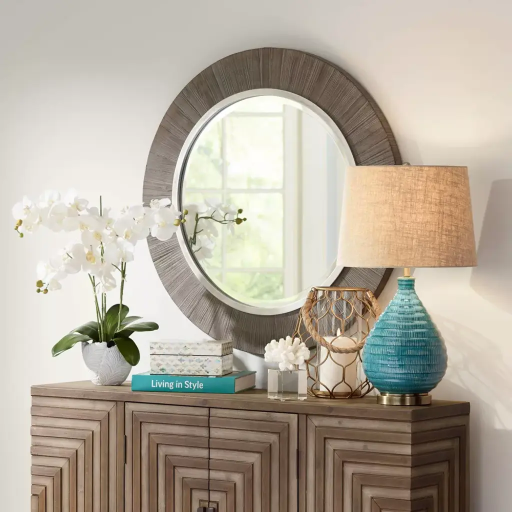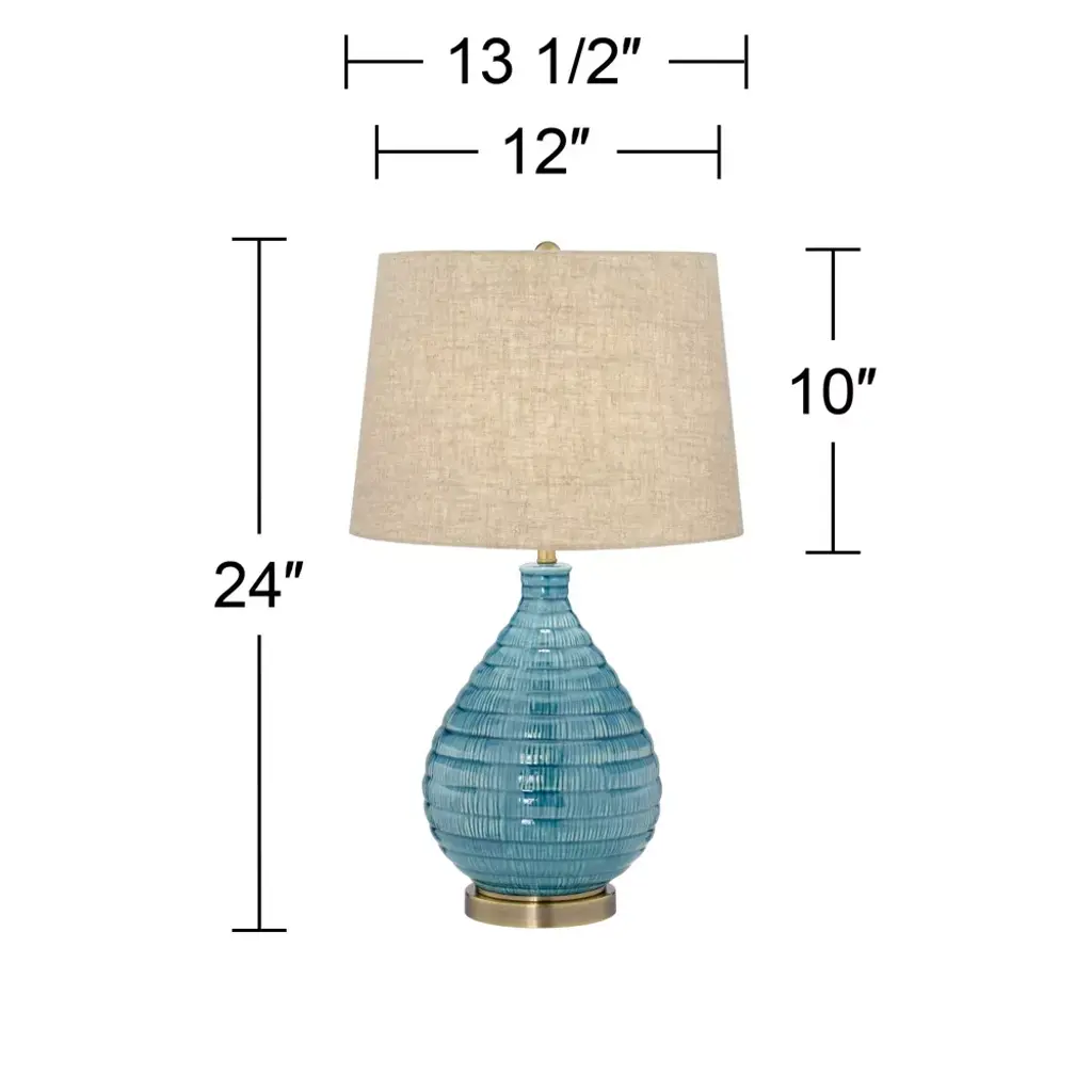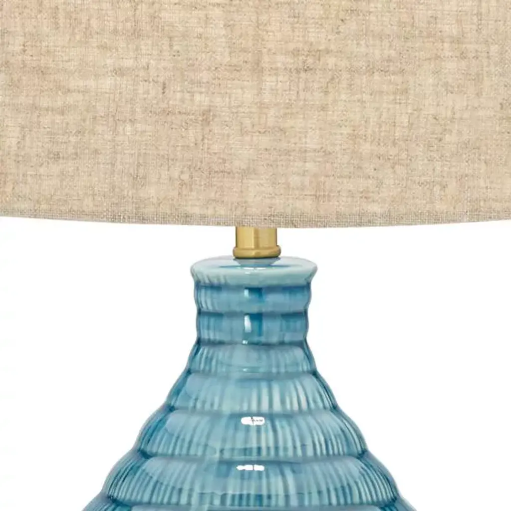 Colorful and sophisticated, this table lamp adds a touch of brightness to any room. Made of ceramic and finished in blue with decorative grooves and ridges for added depth and interest. From the 360 Lighting brand, the lamp's Mid-Century modern lines make it ideal for contemporary settings. Topped with a linen shade.