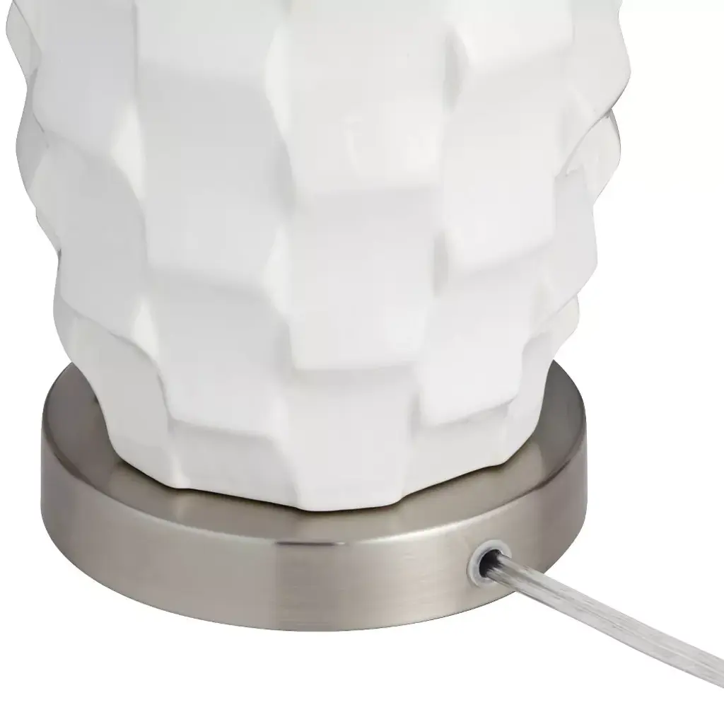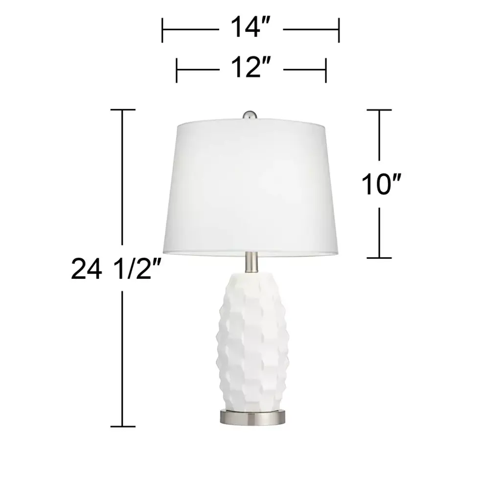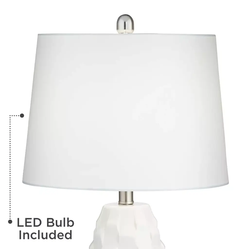 From 360 Lighting, this set of two modern coastal table lamps offers a simple and stylish look for your home. Each lamp is constructed from white finish ceramic, with a scalloped pattern on the body that adds a wavy look. Brushed nickel finish accents and white drum shades provide clean, classy enhancements to the overall design. Two energy-efficient LED bulbs are included for use, one for each lamp, with an in-line dimmer switch that allows you to control the level of lighting.