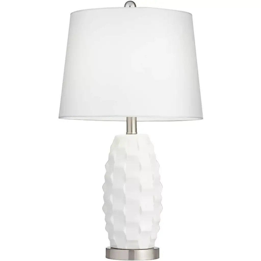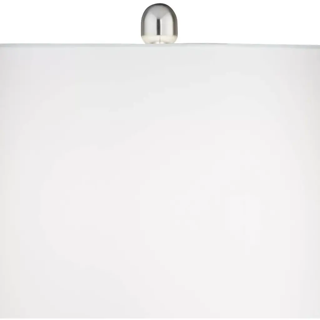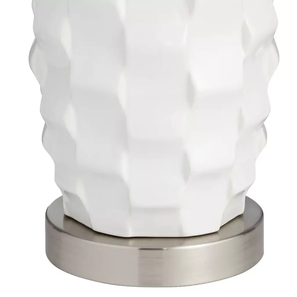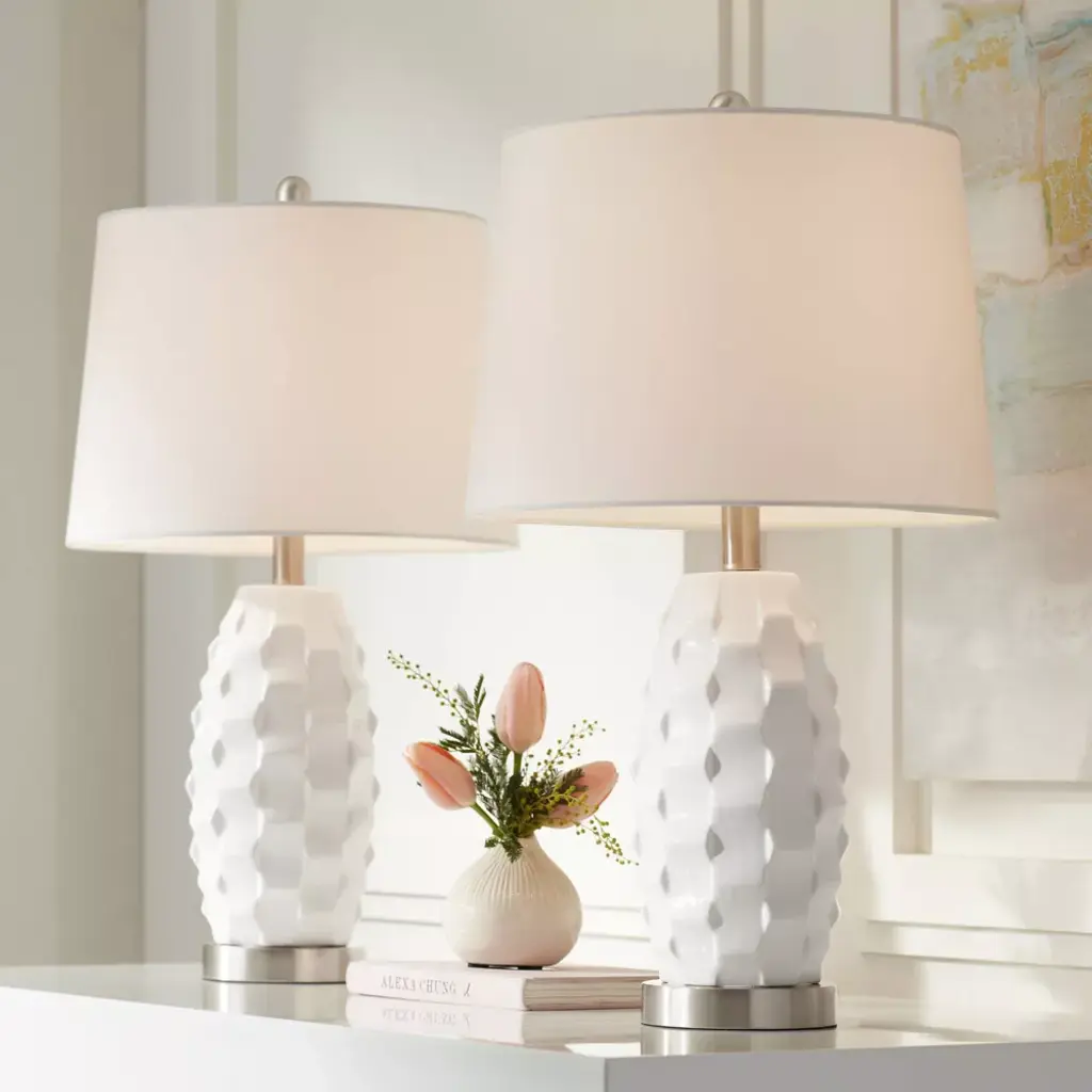 From 360 Lighting, this set of two modern coastal table lamps offers a simple and stylish look for your home. Each lamp is constructed from white finish ceramic, with a scalloped pattern on the body that adds a wavy look. Brushed nickel finish accents and white drum shades provide clean, classy enhancements to the overall design. Two energy-efficient LED bulbs are included for use, one for each lamp, with an in-line dimmer switch that allows you to control the level of lighting.