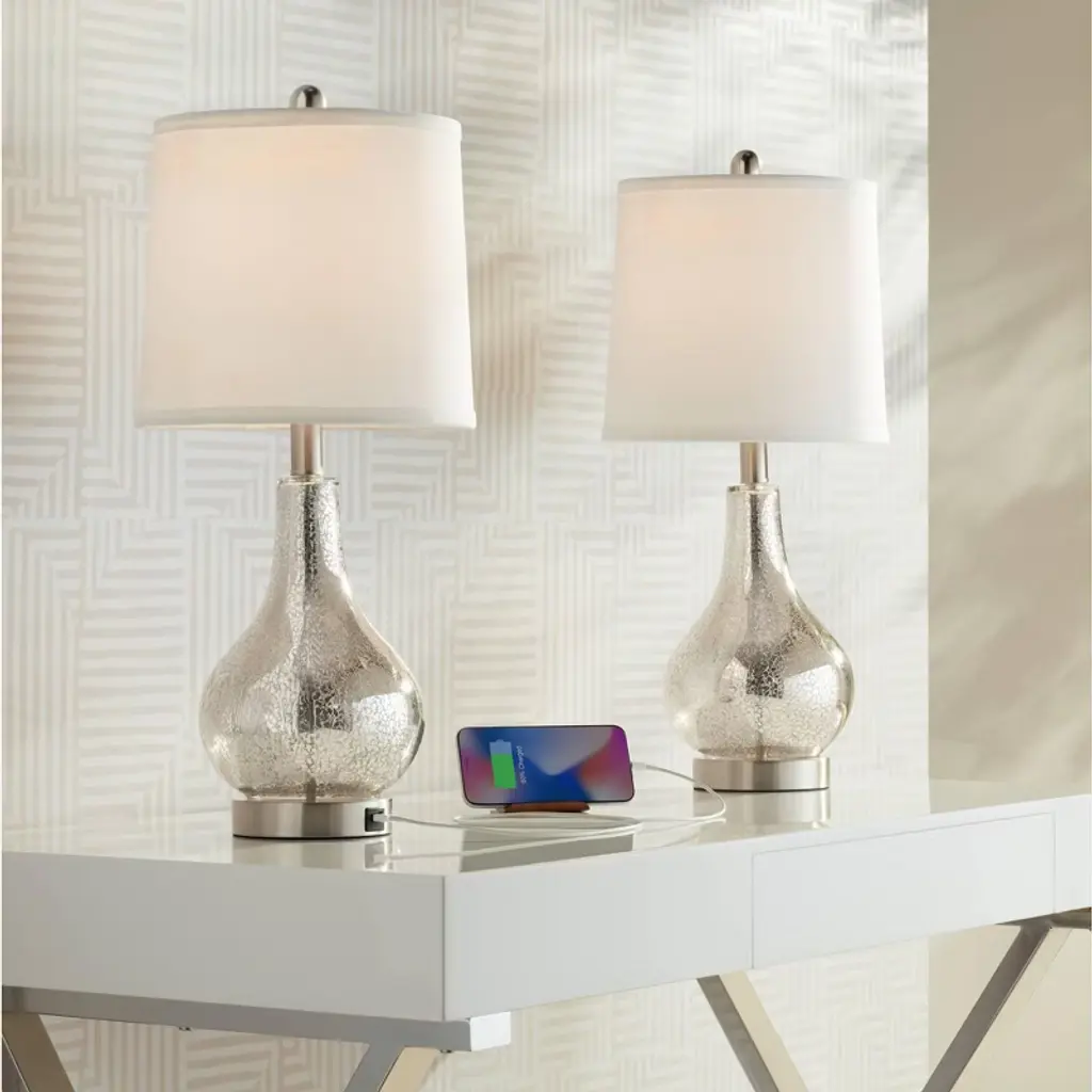 With a beautiful design and modern features, these accent table lamps are a wonderful addition to a living room or bedroom. In a convenient set of two, they come in curving mercury glass bodies that offer a shimmering effect. Brushed nickel finish accents and off-white drum shades add a classic effect to this contemporary design. Each lamp has a USB port built into the base, designed to charge smartphones and other handheld devices.