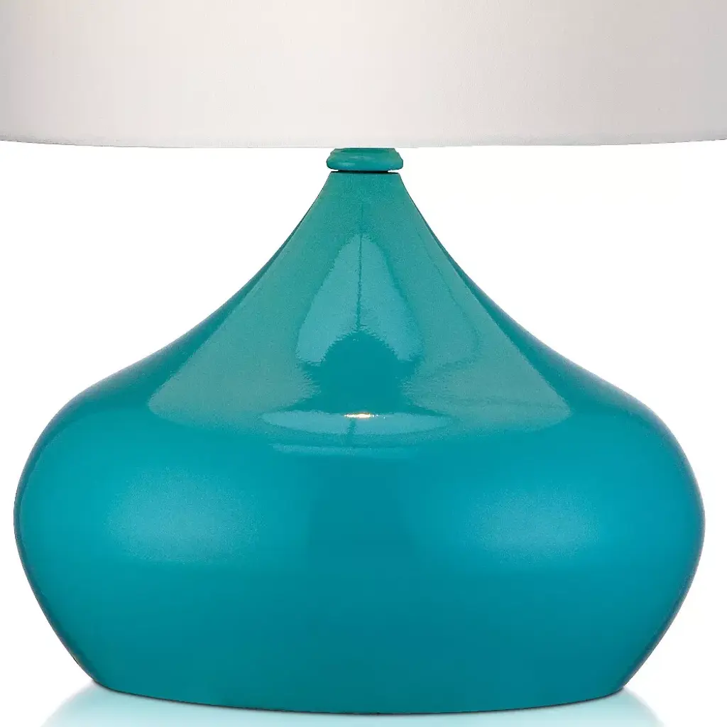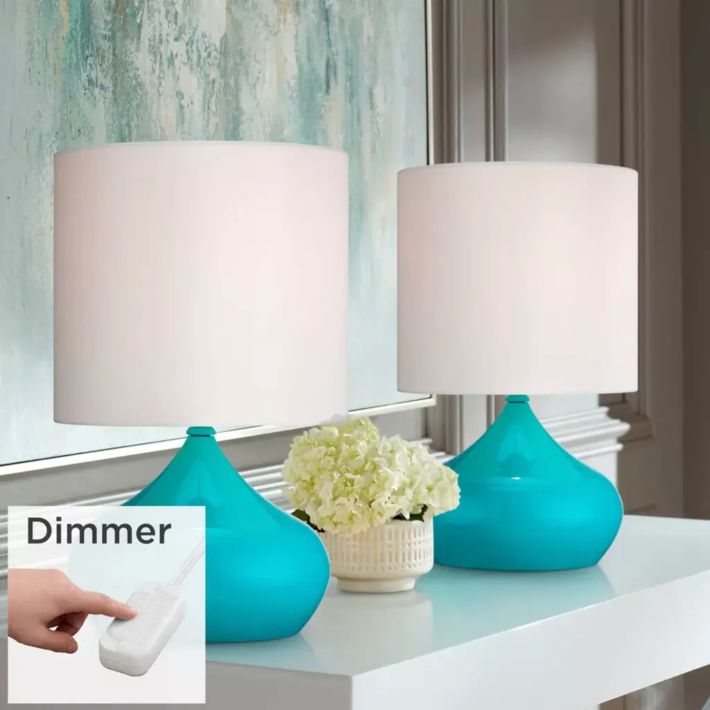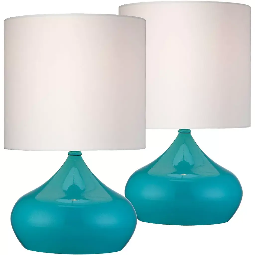 Cool teal blue finish steel droplet bases create an engaging look for this set of two contemporary accent lamps. Ideal displayed together on either side of a hall or console table, or place each on opposite sides of a room to increase the stylish drama. Blue color inspired by tropical, coastal, and nautical lifestyles. This lamp set comes with two tabletop dimmers, one for each lamp, which allows you to control the level of lighting. Simply insert the lamp plug into the dimmer outlet, and then slide the switch on the control to dim or brighten the lighting.