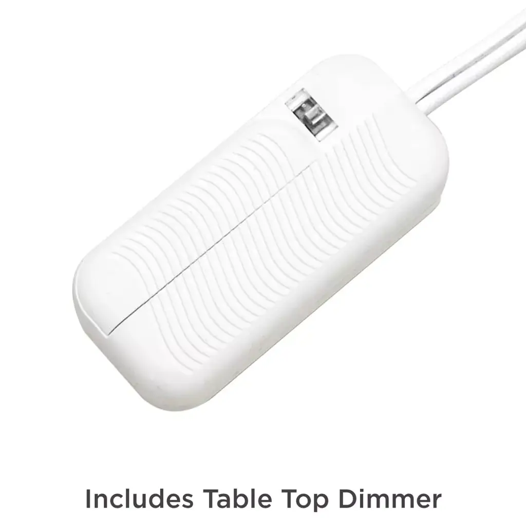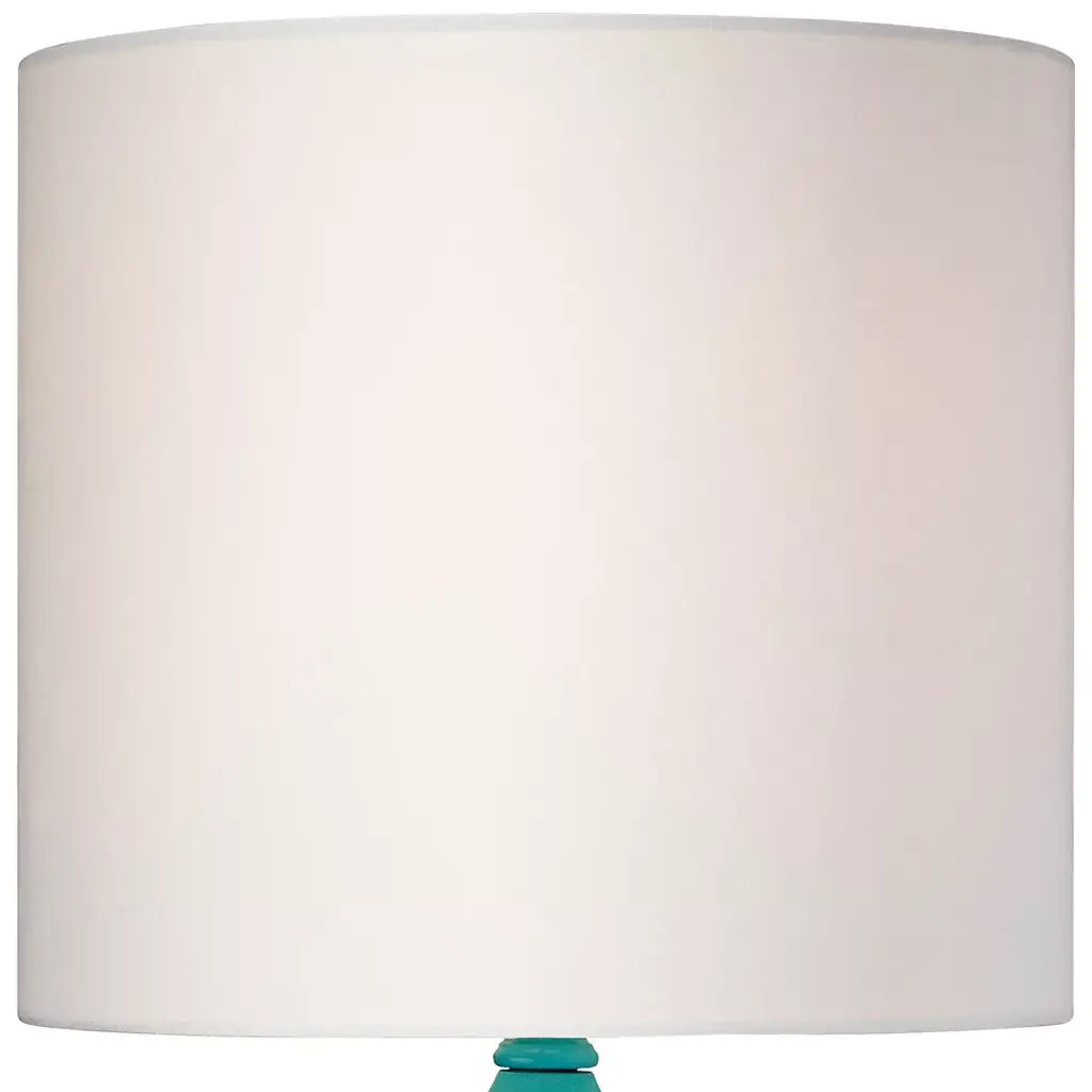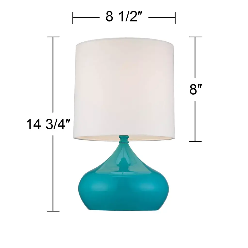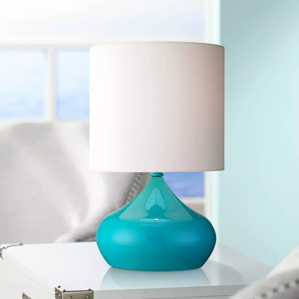 Cool teal blue finish steel droplet bases create an engaging look for this set of two contemporary accent lamps. Ideal displayed together on either side of a hall or console table, or place each on opposite sides of a room to increase the stylish drama. Blue color inspired by tropical, coastal, and nautical lifestyles. This lamp set comes with two tabletop dimmers, one for each lamp, which allows you to control the level of lighting. Simply insert the lamp plug into the dimmer outlet, and then slide the switch on the control to dim or brighten the lighting.