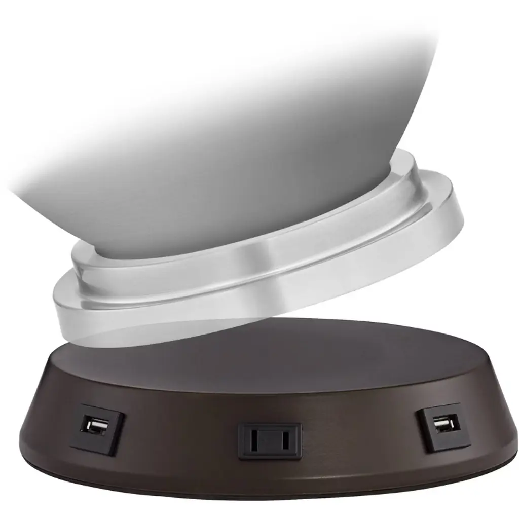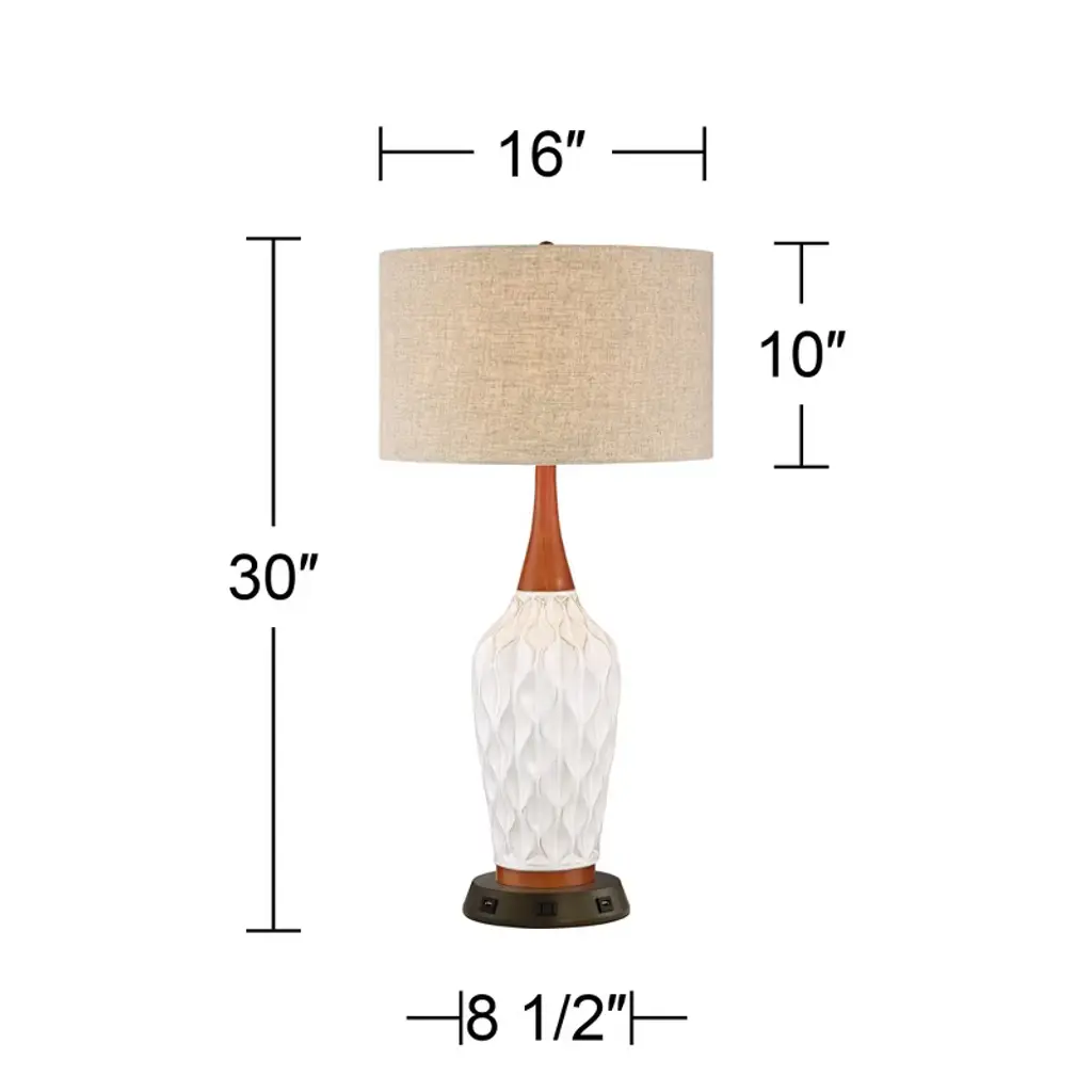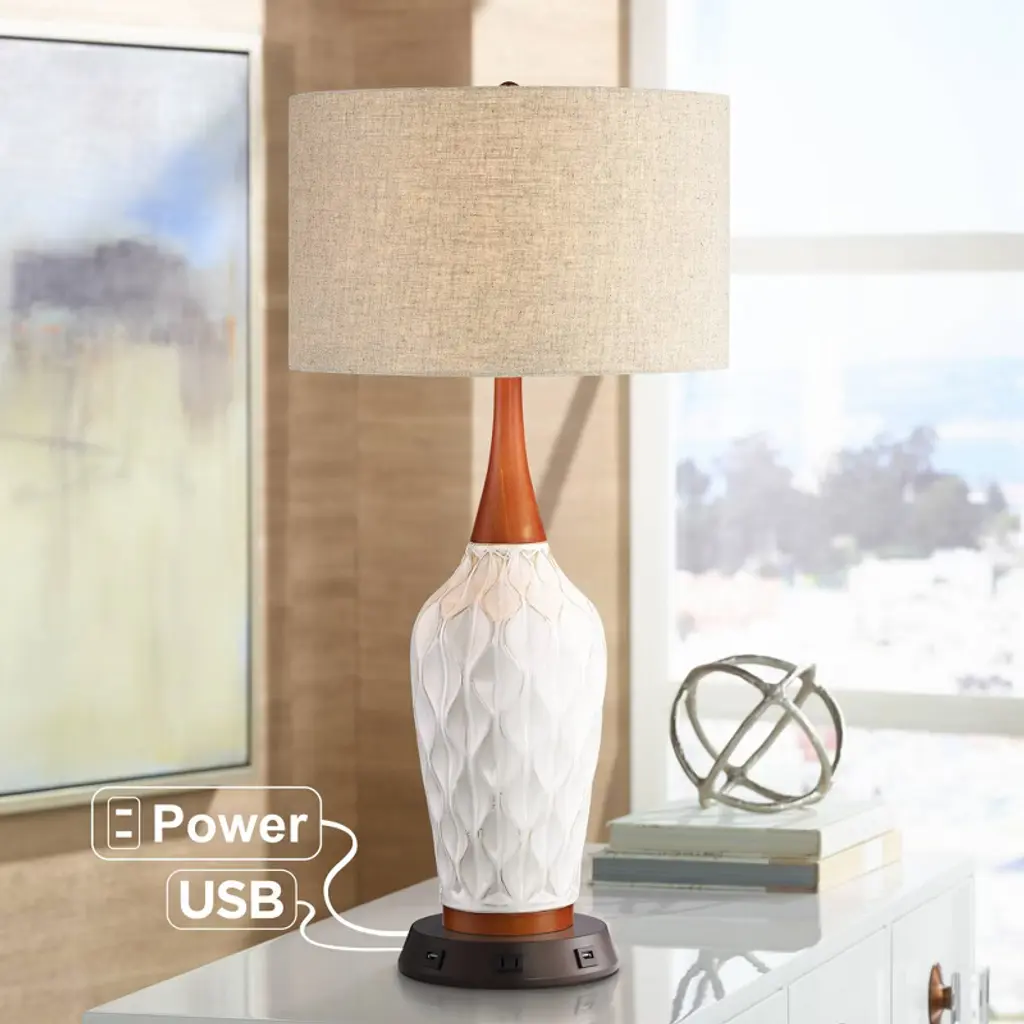 360 Lighting Mid Century Modern Table Lamp With Usb And Ac Power Outlet Workstation Charging Base 30" Tall White Ceramic Drum Shade Bedroom