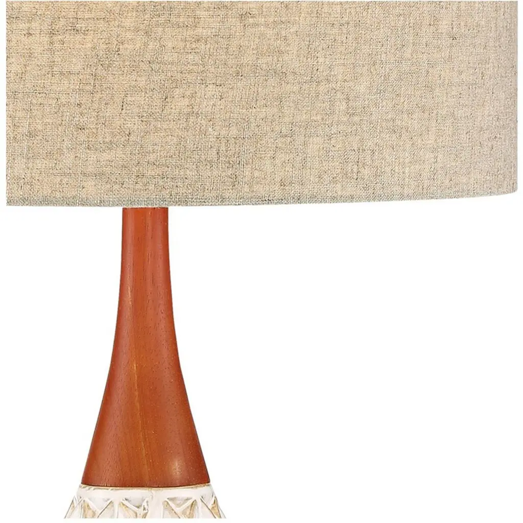 Inspired by the clean lines and architectural elements of a Mid-Century aesthetic, this modern table lamp combines wood and ceramic material. The ceramic body features a wave-like pattern and a thin tapered wooden neck. A drum lamp shade in a warm color completes the look. This table lamp comes with a bronze universal charging station at the bottom, which can be removed and used with other lamps. The charging station has two built-in USB ports and two 2-prong outlets, allowing you to charge up to four devices at a time.