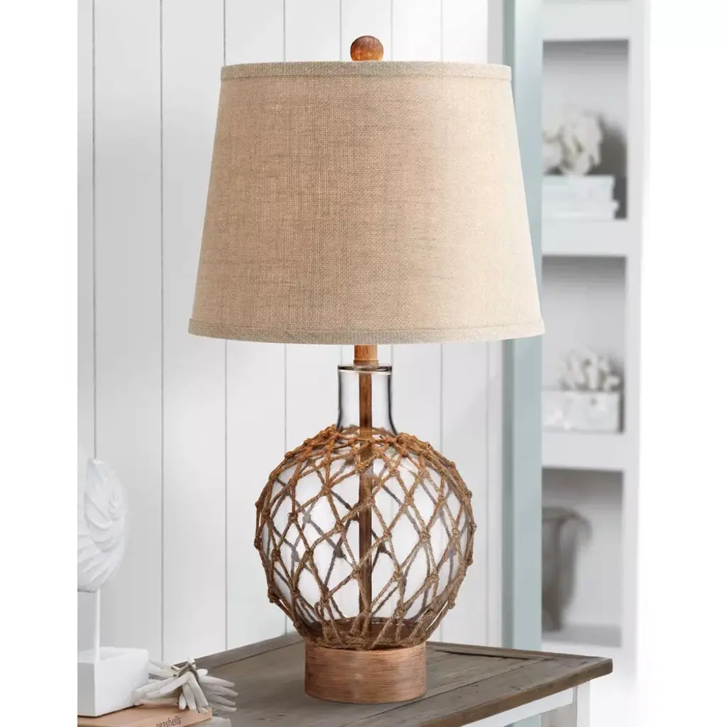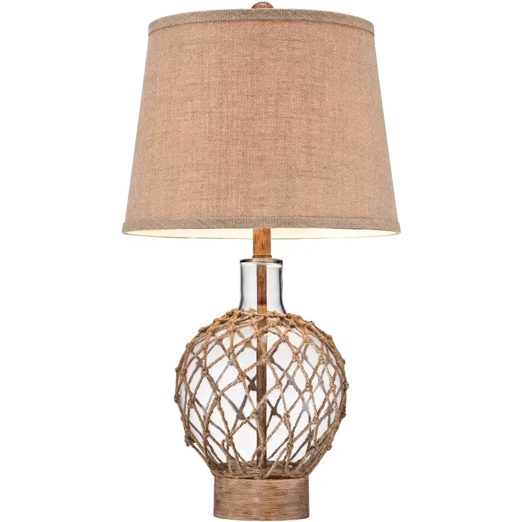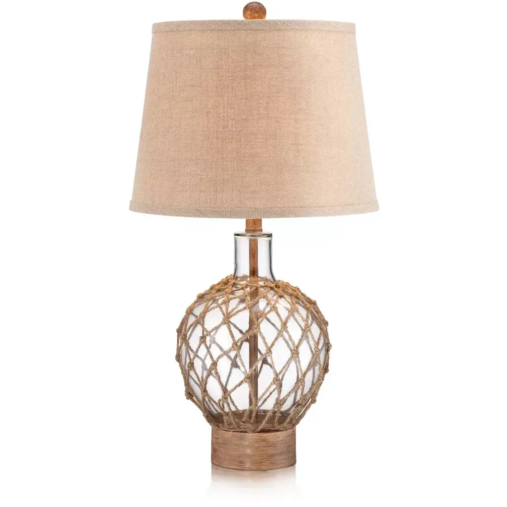 Add a natural look with this glass jug table lamp. The design features a clear glass jug base with a rope overlay. Up top is a burlap drum shade. A natural wood lamp shade finial and wood accents complete the handsome look.