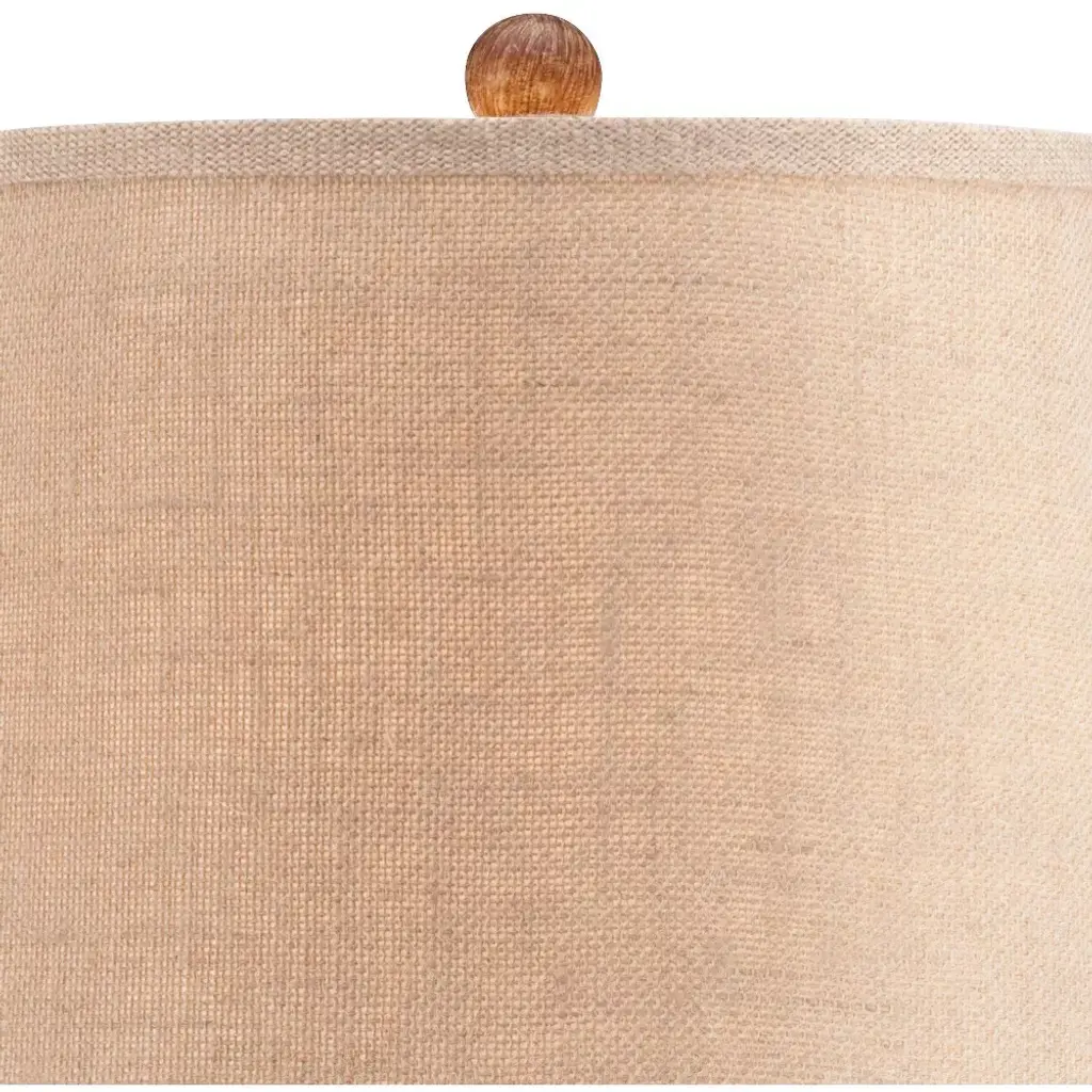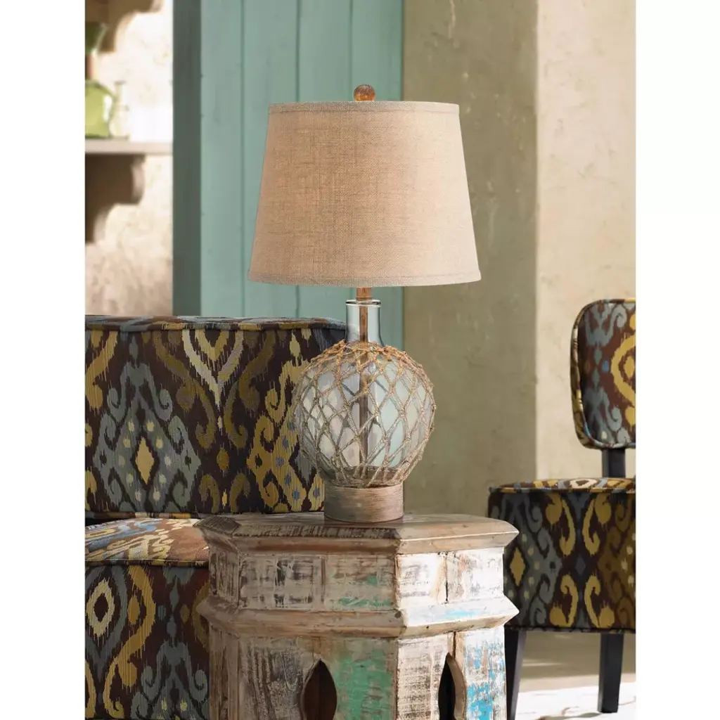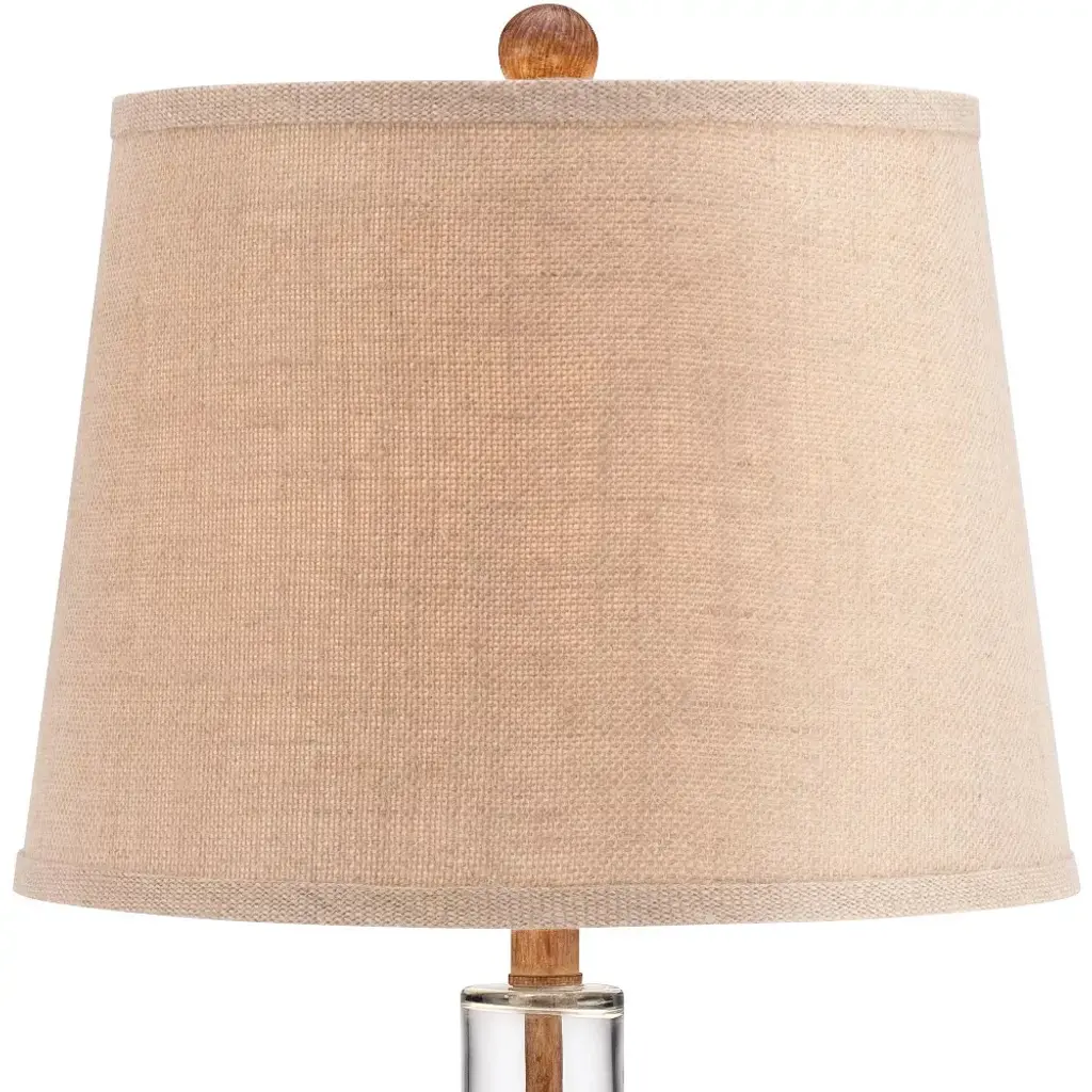 Add a natural look with this glass jug table lamp. The design features a clear glass jug base with a rope overlay. Up top is a burlap drum shade. A natural wood lamp shade finial and wood accents complete the handsome look.