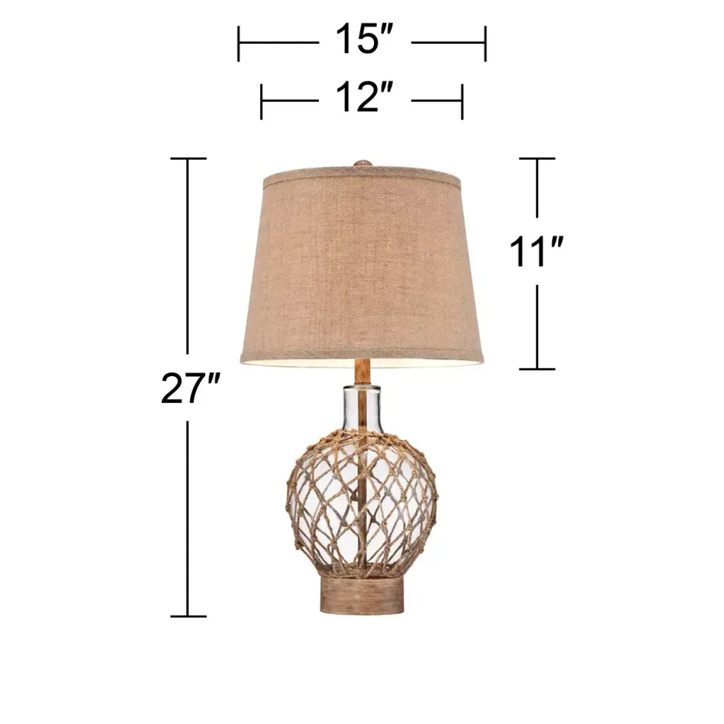 360 Lighting Modern Coastal Table Lamp 27" Tall Clear Glass Rope Net Burlap Fabric Drum Shade For Bedroom Living Room House Bedside Nightstand Office