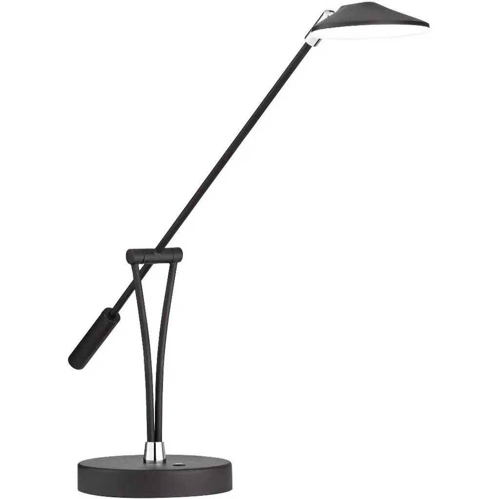 Brighten up your study space with this modern LED desk lamp from the 360 Lighting brand. This metal desk lamp comes in a black finish for a contemporary look, with subtle chrome accenting for that special shine. Two USB ports and a push dimmer switch are built into the base. The adjustable arm moves up and down, allowing you to change the overall height of this lamp.
