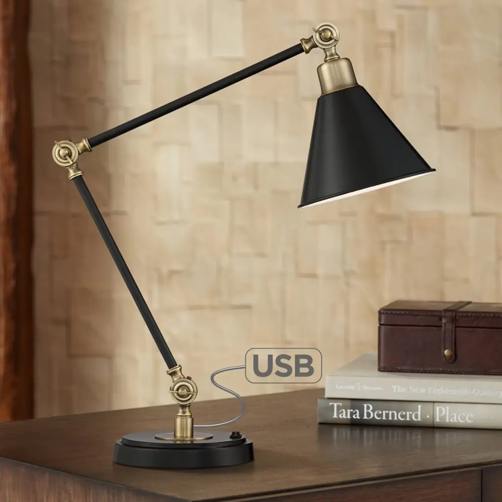 360 Lighting Modern Industrial Desk Table Lamp With Usb Charging Port Adjustable 26.75" High Black Antique Brass For Bedroom Bedside Office