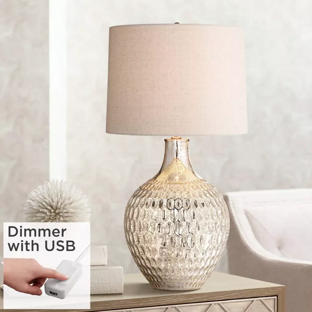 360 Lighting Modern Table Lamp 28" Tall With Usb Charging Port Mercury Glass Off White Drum Shade For Bedroom Living Room House Home Bedside Office