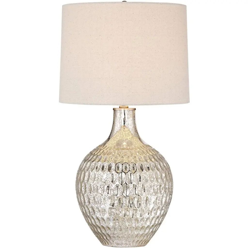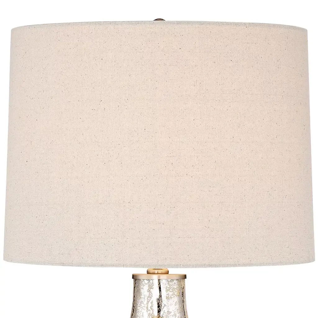 Decorate the modern home with this beautiful mercury glass table lamp. The cool tones in the body are paired with a neutral tone in the off-white drum shade on top. From 360 Lighting. Tabletop dimmer included.