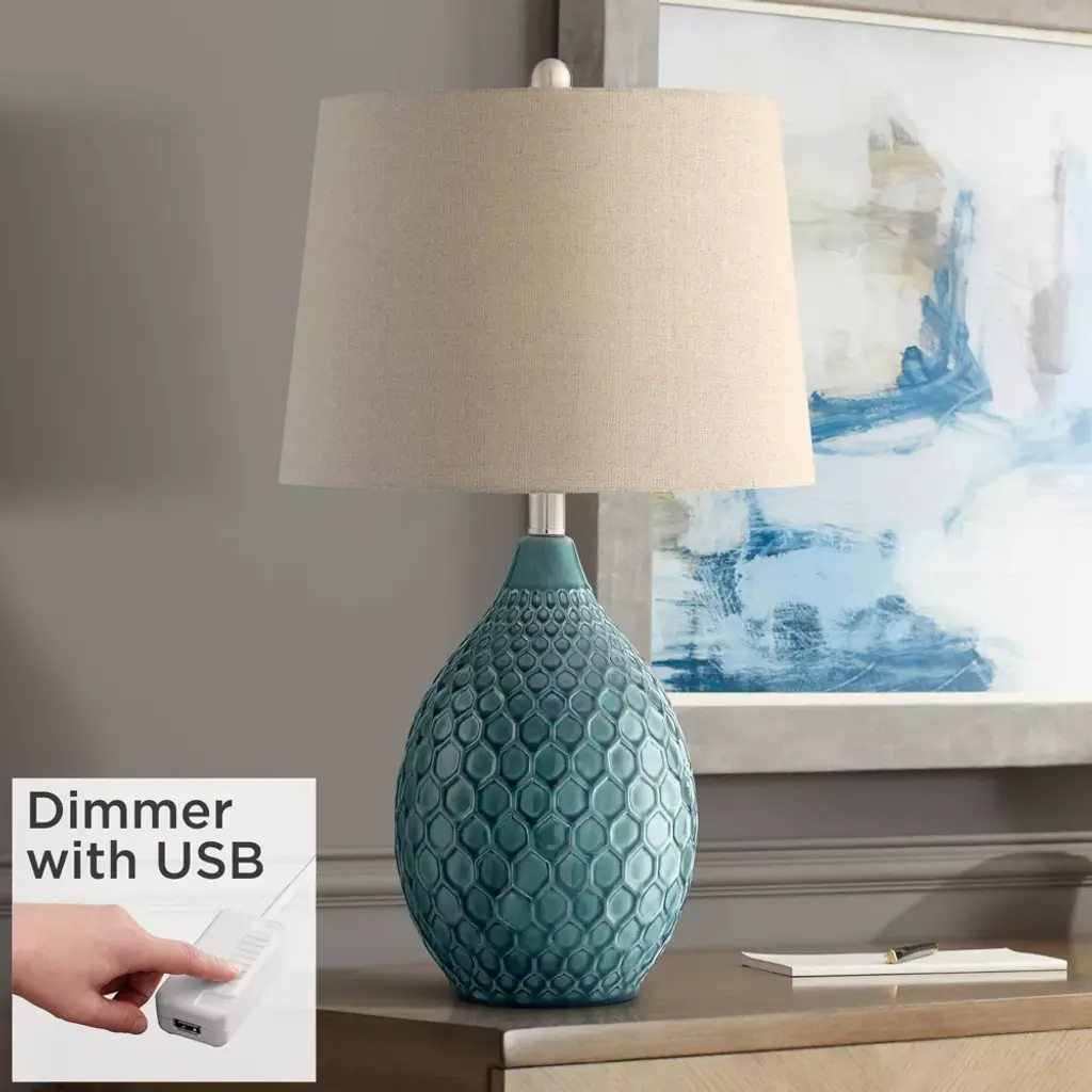 360 Lighting Modern Table Lamp With Usb Charging Port 24 3/4" High Sea Foam Ceramic Oatmeal Drum Shade For Living Room Desk Bedroom