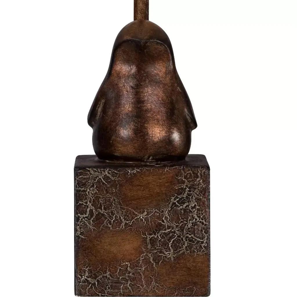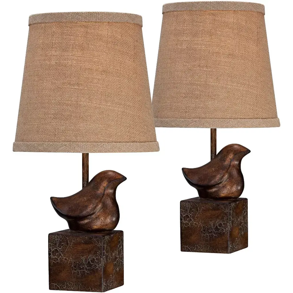Add a sculptural element to your decor with this set of two small accent table lamps, which features the delightful profile of a bird. The contemporary sculptural bird in a bronze-brown finish sits on a cube base with a crackled duo-tone finish. A burlap drum shade lends a natural touch to this modern design with an organic look.