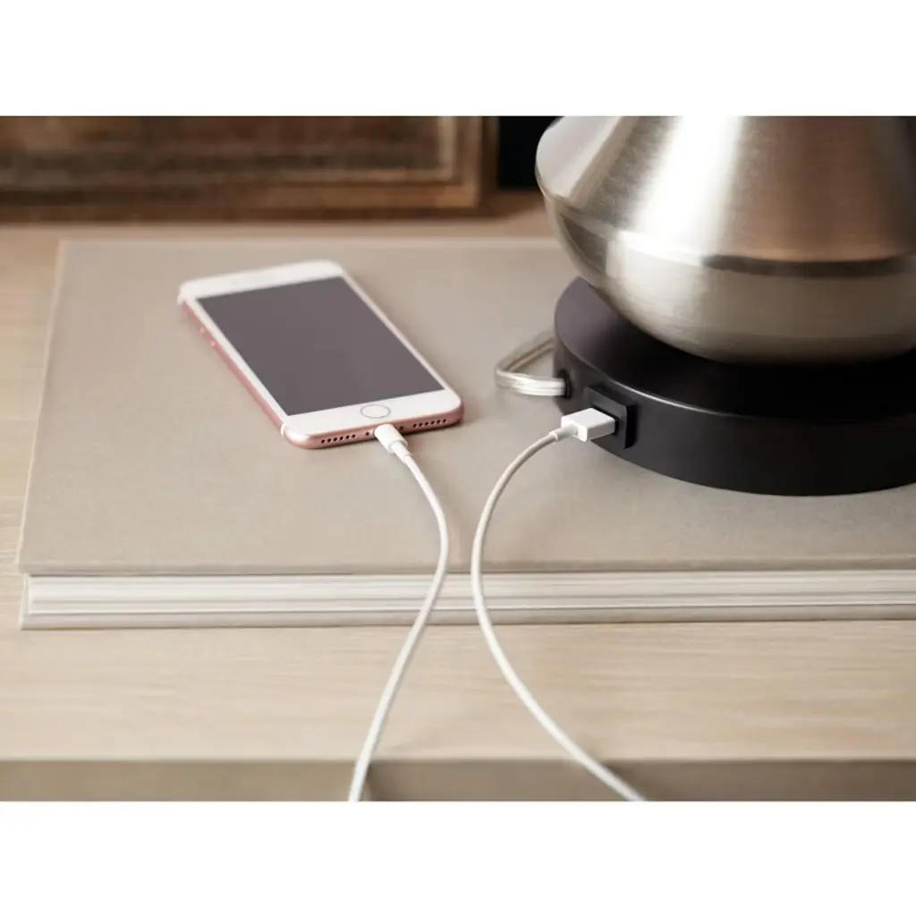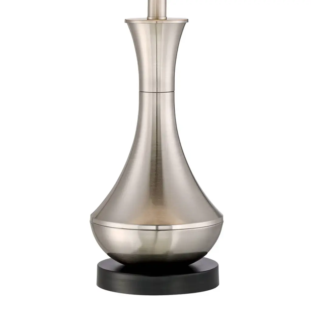 Charge a phone or small electronic device easily with the Simon table lamp set. The two matching table lamps feature a sleek modern design in a brushed nickel finish. The built-in dual USB ports in each lamp allows you to easily keep your phones and electronic devices charged up and close at hand. Up top are Empire profile white fabric tapered lamp shades. A great design for use in a bedroom, on an end table, or in a home office.