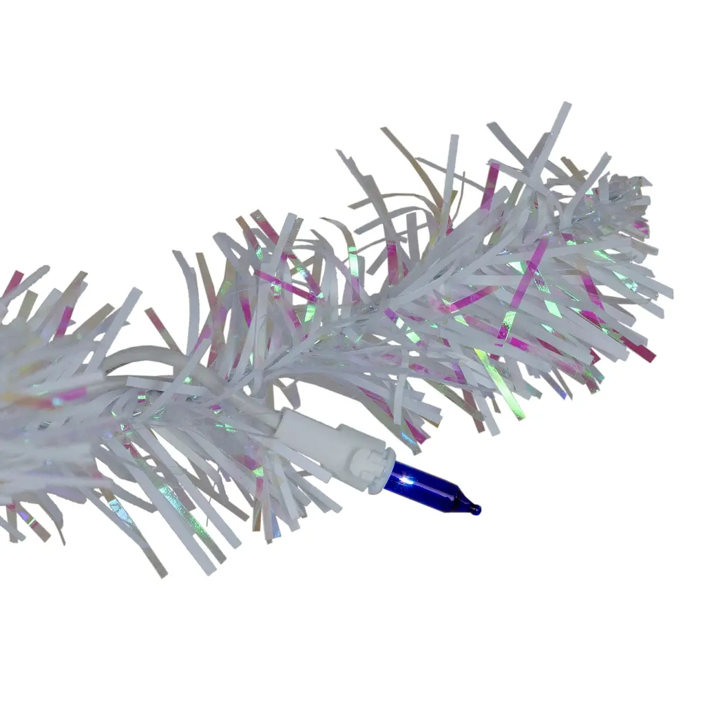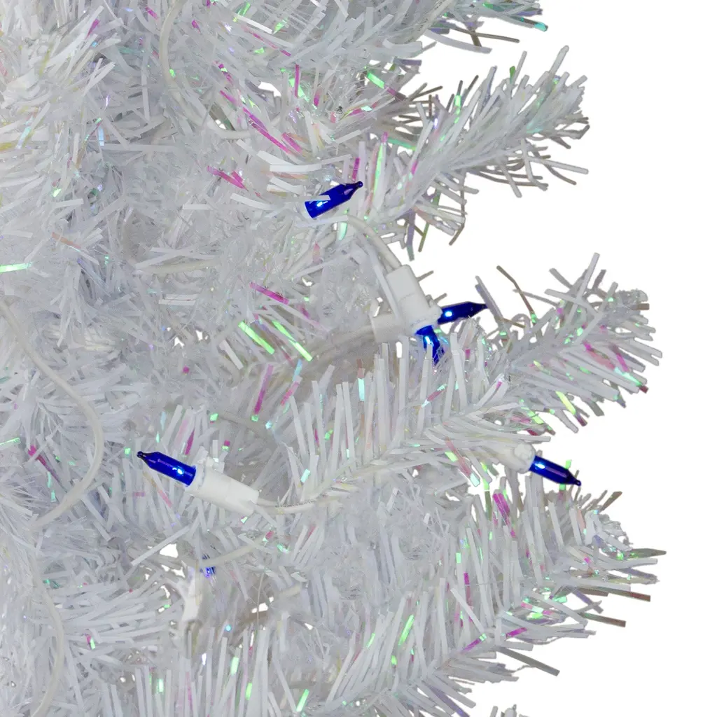 This 4ft white pine artificial Christmas tree has iridescent branches wrapped in blue lights with white wiring. Small enough to fit in most spaces and easy to assemble and decorate! Also looks great as is. Product Features: Pre-lit with 70 blue lights Bulb size: mini 110 tips 2" wide tips 36” white lead cord Additional Product Features: Medium profile tree Bendable wire branches UL certified and approved for indoor use If one bulb burns out, the rest will stay lit Lights are equipped with lamp lock which makes them replaceable Interchangeable and keeps them from falling out Comes with replacement bulbs and spare fuses Comes with FREE plastic white tree stand 120 volts, 60 hertz, .24amps, 28.8 watts Dimensions: 4' high (from the base of stand to the top of the tree 23" base diameter (at the widest point) Material(s): PVC/plastic/metal/bulbs/wireNote: Branches are compressed for shipment, and need to be fluffed out upon arrival to look like the photo.