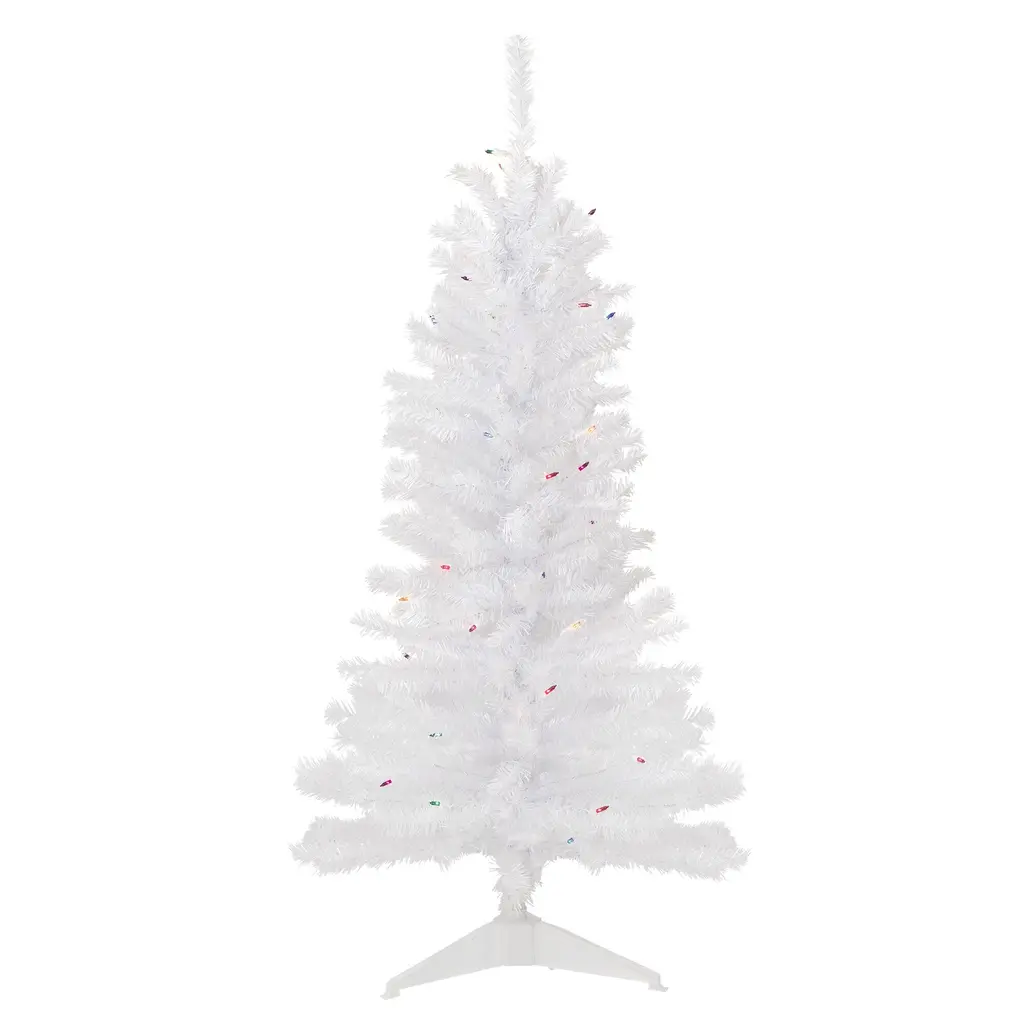 Transform your space into a winter wonderland with the beautiful Woodbury White Pine tree. It is a designer-inspired alternative to a traditional green tree with its dazzling white pine needles sure to reflect the light from the vibrant multi-color mini lights that it comes adorned with. The lush needles give the tree fullness but the slim profile makes it ideal for small spaces and allows it to fit perfectly in corners. Product features: Pre-lit with 50 multi-color lights. Multi-color consists of red green blue pink and orange bulbs. Bulb size: mini. Bulb type: incandescent. 187 tips. 1.5" wide branch tips. 26" white lead cord. Slim profile tree. Additional product features: Light sets on tree are UL listed for indoor or outdoor use however the tree itself is recommended for indoor use only. If one bulb burns out the rest will stay lit. Lights are equipped with Lamp Lock feature which makes them replaceable interchangeable and keep them from falling out. Includes a white plastic tree stand. 2-piece easy assembly (including stand). Wire gauge: 22. 120 volts 60 hertz .17 amps 20.4 watts. Dimensions: 4' high (from the base of the stand to the top of the tree). Distance from floor to the first row of branches: 6". 24" base diameter (at the widest point). Material(s): PVC/plastic/glass bulbs/wire. Note: Branches are compressed for shipment and need to be fluffed out upon arrival to look like the photo.