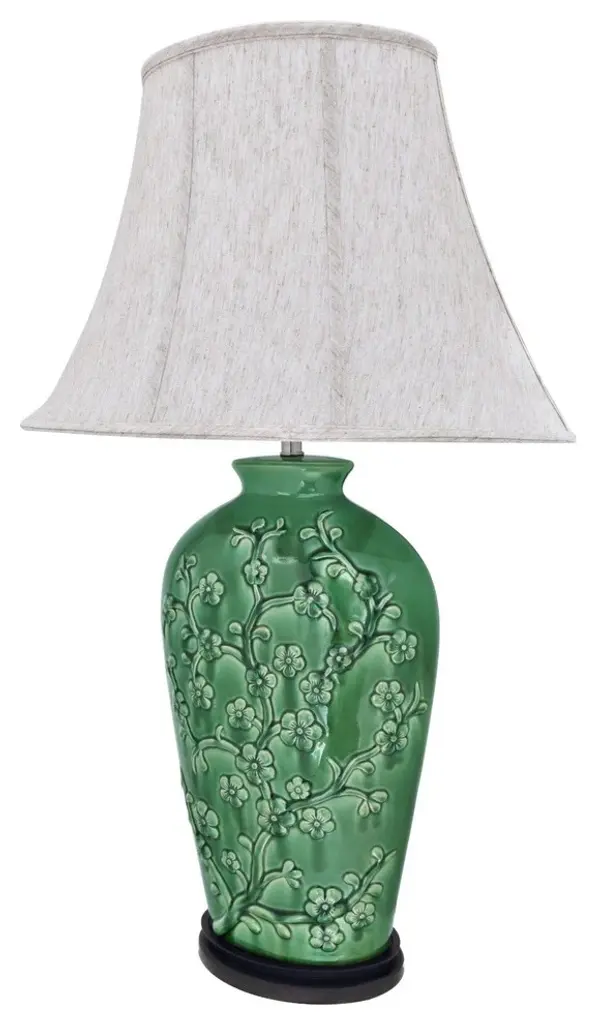 Aspen Creative is dedicated to offering a wide assortment of attractive and well-priced portable lamps, kitchen pendants, vanity wall fixtures, outdoor lighting fixtures, lamp shades, and lamp accessories. We have in-house designers that follow current trends and develop cool new products to meet those trends. Product Detail• Green Glaze finish with floral embossed design and dark wood base• Lampshade color & type - Off White, Linen Fabric, Oval bell shaped lamp shade• Lamp shade size - 10" x 7" top x 20" x 11" bottom x 13 1/2" slant height• ON/OFF switch, Uses a medium base light bulb, 100 watt max, Light bulb not included, UL Listed