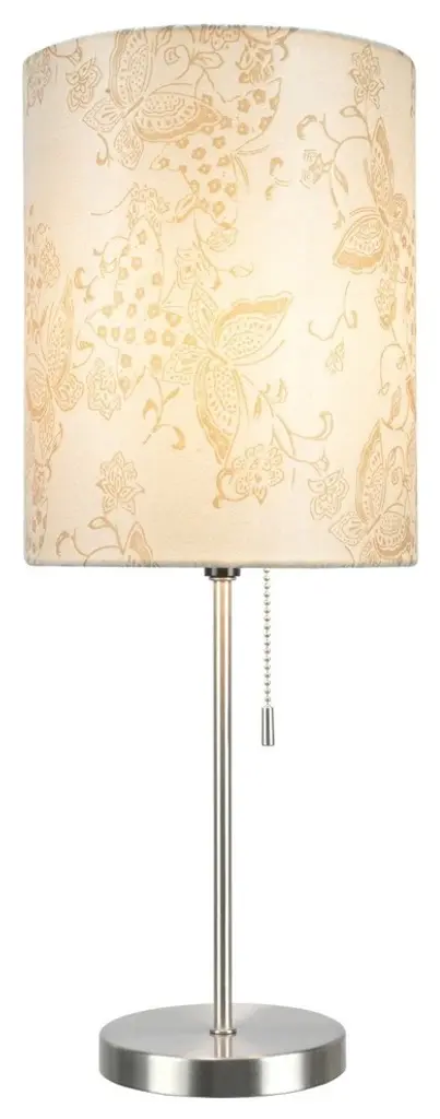 Aspen Creative is dedicated to offering a wide assortment of attractive and well-priced portable lamps, kitchen pendants, vanity wall fixtures, outdoor lighting fixtures, lamp shades, and lamp accessories. We have in-house designers that follow current trends and develop cool new products to meet those trends. Product Detail• Hardback Drum (Cylinder) Embroidery Fabric Lamp Shade in Ivory with Butterfly Design, 8" top x 8" bottom x 10" height | Metal construction in Satin Nickel• Uses 1 (E26) medium base light bulb, 60 watt max, Light bulb not included• On/Off Pull Chain Switch, UL listed for indoor, dry location.• Our hardback shades use Virgin Styrene backing board to produce a warm, natural & smooth light more appealing than shades made with recycled Styrene board that can crack & yellow over time.