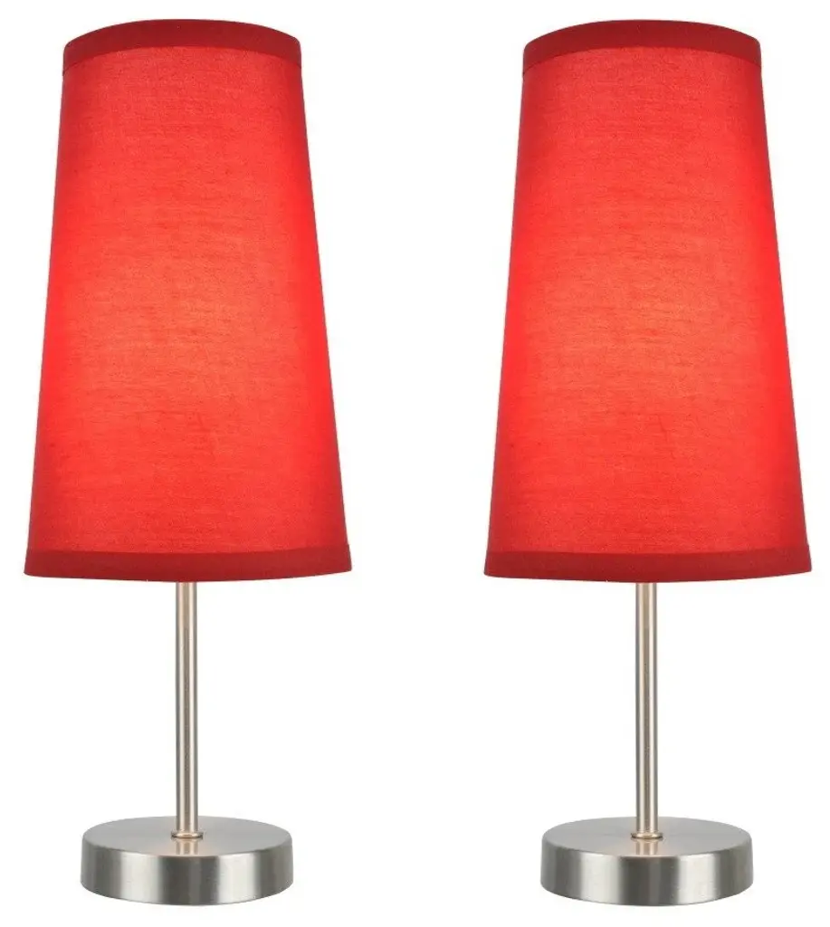 Aspen Creative is dedicated to offering a wide assortment of attractive and well-priced portable lamps, kitchen pendants, vanity wall fixtures, outdoor lighting fixtures, lamp shades, and lamp accessories. We have in-house designers that follow current trends and develop cool new products to meet those trends. Product Detail• Hardback Empire Fabric Lamp Shade in Red, 4" top x 5 1/2" bottom x 9" height | Metal construction in Satin Nickel• Uses 1 (E12) candelabra base light bulb, 40 watt max, Light bulb not included• On/Off Power Cord Switch, UL listed for indoor, dry location.• Our hardback shades use Virgin Styrene backing board to produce a warm, natural & smooth light more appealing than shades made with recycled Styrene board that can crack & yellow over time.
