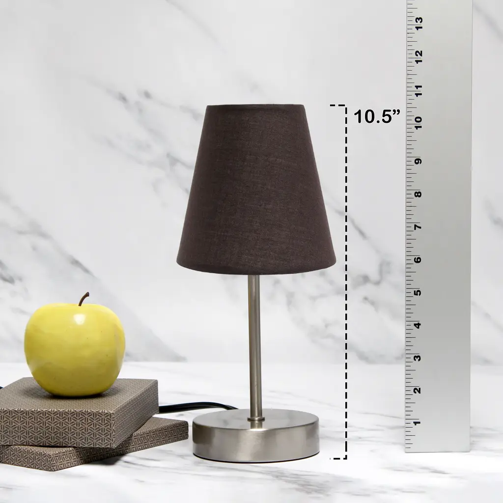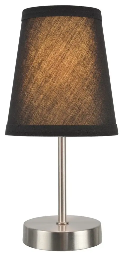 Aspen Creative is dedicated to offering a wide assortment of attractive and well-priced portable lamps, kitchen pendants, vanity wall fixtures, outdoor lighting fixtures, lamp shades, and lamp accessories. We have in-house designers that follow current trends and develop cool new products to meet those trends. Product Detail• Hardback Empire Fabric Lamp Shade in Black, 3 1/2" top x 5" bottom x 5 1/2" height | Metal construction in Satin Nickel• Uses 1 (E12) candelabra base light bulb, 40 watt max, Light bulb not included• On/Off Power Cord Switch, UL listed for indoor, dry location.• Our hardback shades use Virgin Styrene backing board to produce a warm, natural & smooth light more appealing than shades made with recycled Styrene board that can crack & yellow over time.
