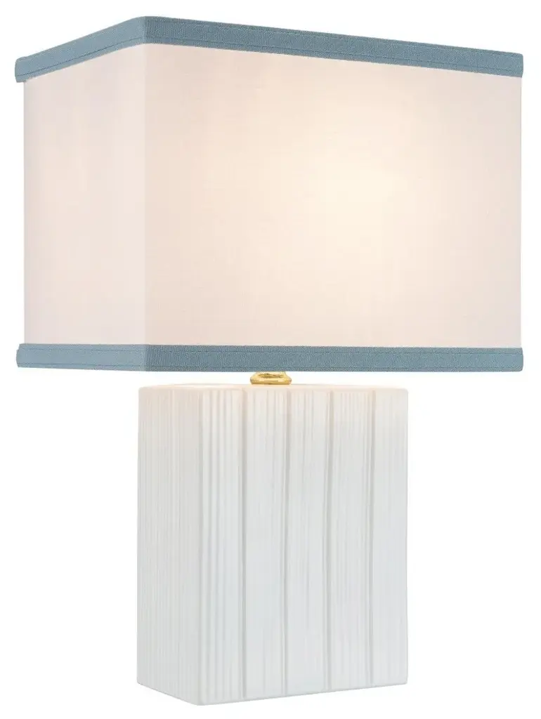Aspen Creative is dedicated to offering a wide assortment of attractive and well-priced portable lamps, kitchen pendants, vanity wall fixtures, outdoor lighting fixtures, lamp shades, and lamp accessories. We have in-house designers that follow current trends and develop cool new products to meet those trends. Product Detail• Ivory finish• Lampshade color & type - Off White, Faux Brussel Fabric with light blue double trim on top and bottom, Hardback Rectangle shaped lamp shade | Lamp shade size - 10" + 7" top x 10" + 7" bottom x 7 1/2" height• ON/OFF switch, Uses a medium base light bulb, 100 watt max, Light bulb not included, UL Listed• Our hardback shades use Virgin Styrene backing board to produce a warm, natural & smooth light more appealing than shades made with recycled Styrene board that can crack & yellow over time.