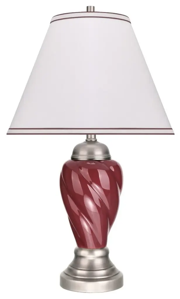 Aspen Creative is dedicated to offering a wide assortment of attractive and well-priced portable lamps, kitchen pendants, vanity wall fixtures, outdoor lighting fixtures, lamp shades, and lamp accessories. We have in-house designers that follow current trends and develop cool new products to meet those trends. Product Detail• Ivory finish with Pewter Finish Base• Lampshade color & type - Off White with claret double trim on top and bottom, Hardback Empire shaped lamp shade | Lamp shade size - 7" top x 15 1/2" bottom x 11 1/2" slant height• ON/OFF switch, Uses a medium base light bulb, 100 watt max, Light bulb not included, UL Listed• Our hardback shades use Virgin Styrene backing board to produce a warm, natural & smooth light more appealing than shades made with recycled Styrene board that can crack & yellow over time.