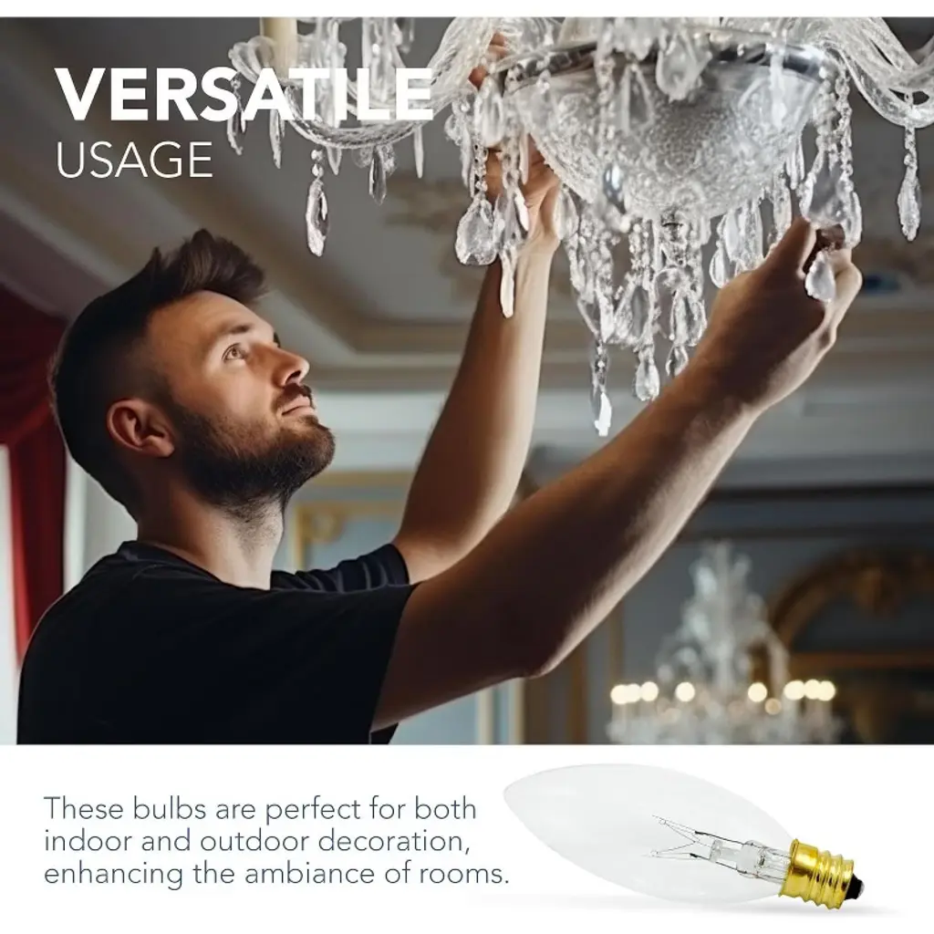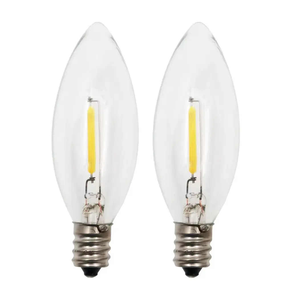 Brighten your space with this 6-pack of 120V 7W C7 clear light bulbs. Featuring a candelabra E12 base, they're perfect for window candles, holiday décor, night lights, and small lamps. The classic torpedo shape and nickel-plated base ensure a secure fit and long-lasting performance. Enjoy steady, flicker-free light with easy screw-in installation. Ideal for everyday use or festive displays, this reliable set is great for replacing chandelier or Christmas village bulbs.