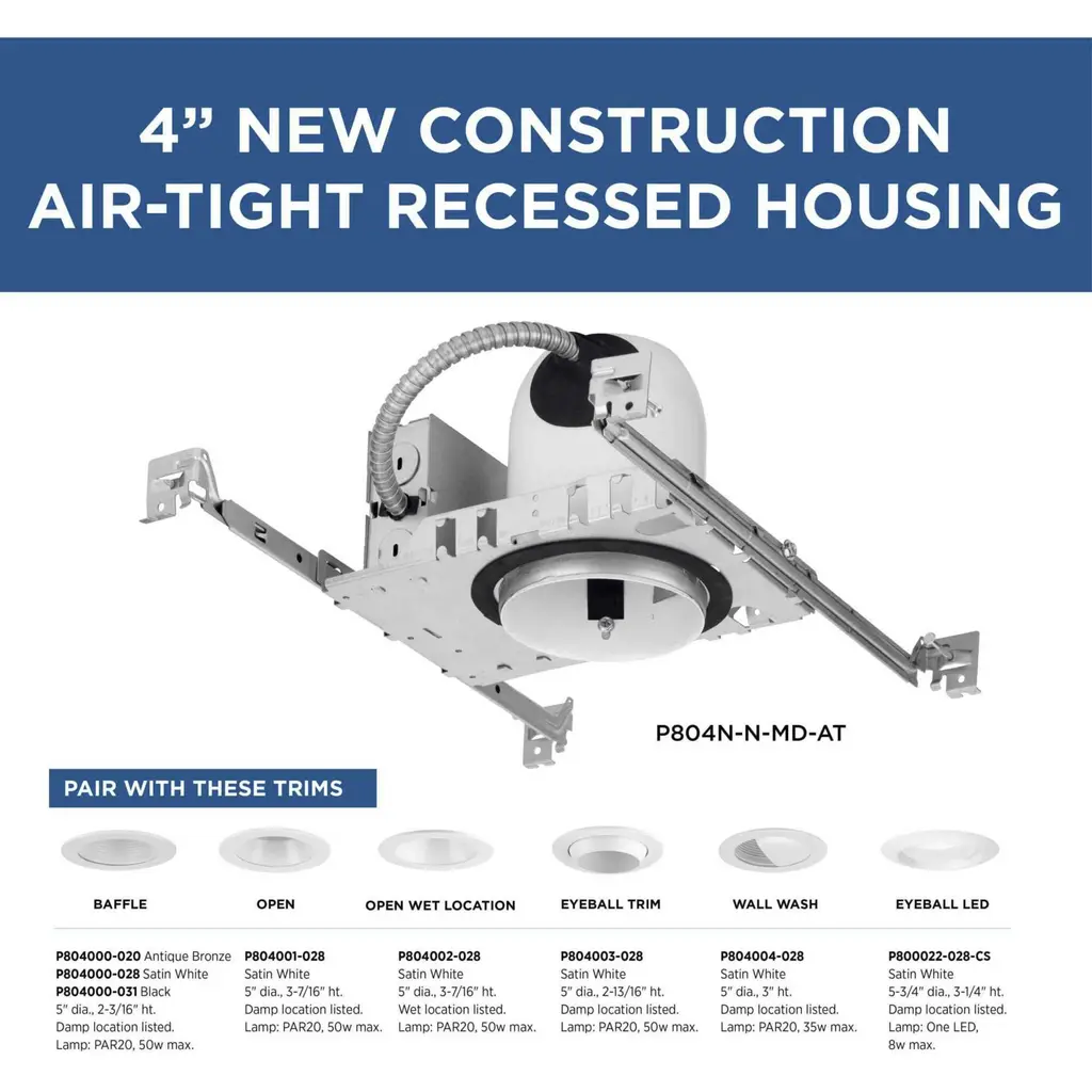 This 4 in. small-aperture Air-Tight Non-IC New Construction Housing provides accent and task lighting for new construction applications and is ideal for those who have easy access above the ceiling. Use with a variety of trims and finishes to create different lighting effects or match any decor. Its gasketed air-tight lamp housing prevents conditioned air from escaping into the attic space, reducing unnecessary HVAC energy usage. The lamp housing compartment can be adjusted to fit ceiling thicknesses from in. to 1 in. The housing and frame are constructed from die-formed corrosion resistant galvanized steel. It features a universal J-box with snap-out sides and provided with push in connectors to make wiring quick and easy. Bar hangers have a maximum span of 24 in. and are scored in two locations for fast, clean breaking, allowing housing installation in very narrow joist spacings. Pre-installed framing nails on the bar hangers make installation quick and efficient. Hanger bars include t-bar mounting clamps for use in suspended t-grid ceilings. The integrated temperature sensor prevents lamp overheating, allowing this fixture to be used with a range of lamp shapes and wattages. It is UL and CUL listed for damp locations and Non-IC installation. The housing is compatible with a variety of trims and finishes to create different lighting effects or to easily match any decor.