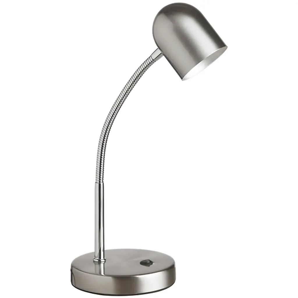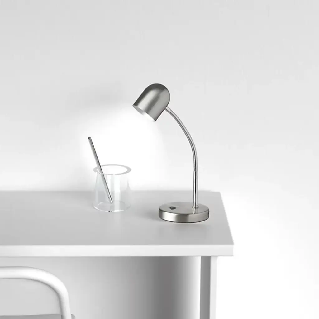 Make an elegant and functional addition to your desk, workspace, or side table with the 5W LED Table Lamp from Dainolite. A simple fixture that starts with a switched disc base, it sends up a small metal stem that quickly transforms into an articulated arm. This simple construction supports integrated LED lamping set inside a dome-shaped metal shade that screens excess brightness from the sides to focus a potent task light anywhere you need it.