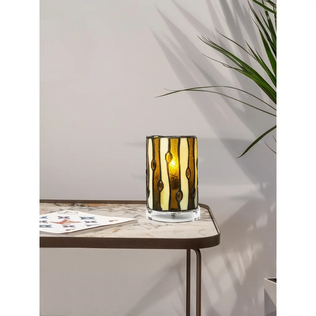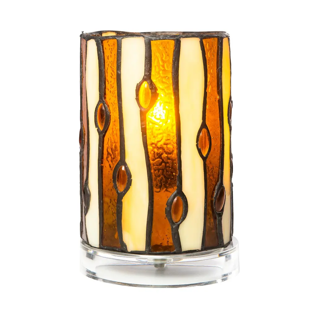 Dale Tiffany Diamond Hill Tiffany Accent Lamp: This accent lamp showcases a harmonious blend of tan and brown Tiffany glass, adorned with matching brown glass beads, evoking the ambiance of a candle, all elegantly supported by a contemporary acrylic base.
