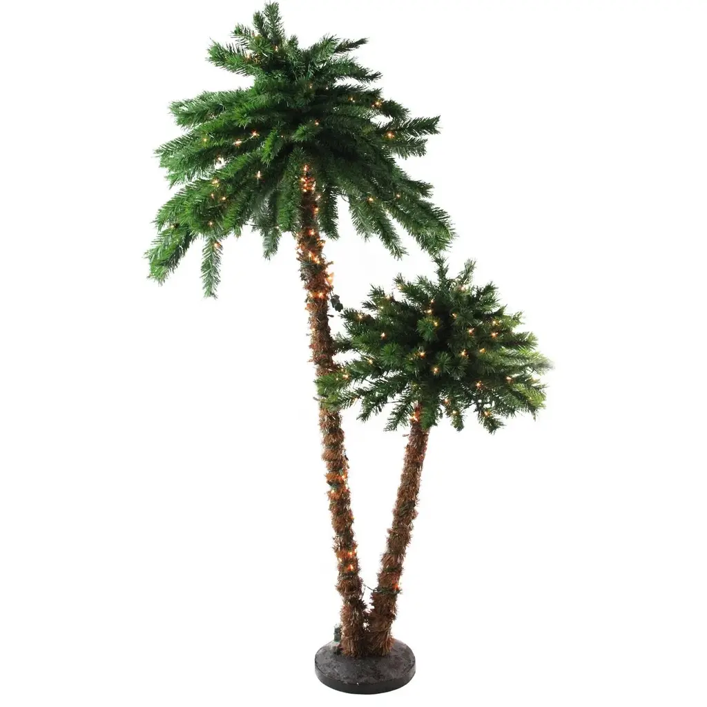 Impress your family and friends with this gorgeous tropical palm tree that is easily put up and taken down with its hinged branch construction. This tree is durable and beautiful enough to use year after year even with the ever-changing trends. This interesting piece brings a lifelike touch to your living spaces. Product Features: Pre-lit with a total of 300 clear lights. Bulb size: mini lights. Small tree has 64 tips. Large tree has 106 tips. 2.5" wide tapered tips. 9" green lead cord. Additional Product Features: If one bulb burns out the rest will stay lit. Lights are equipped with Lamp Lock feature which makes them replaceable interchangeable and keeps them from falling out. 4-piece easy assembly (including stand). Comes with a sturdy metal base. Recommended for indoor use or outdoors under a covered area. Wire gauge: 22. 120 hertz 60 amps 40.8 watts. Dimensions: 6' high (from the base of the stand to the top of the tallest tree). Tree trunk dimensions: 34" and 64" tall. Material(s): PVC/metal/glass bulbs/wire