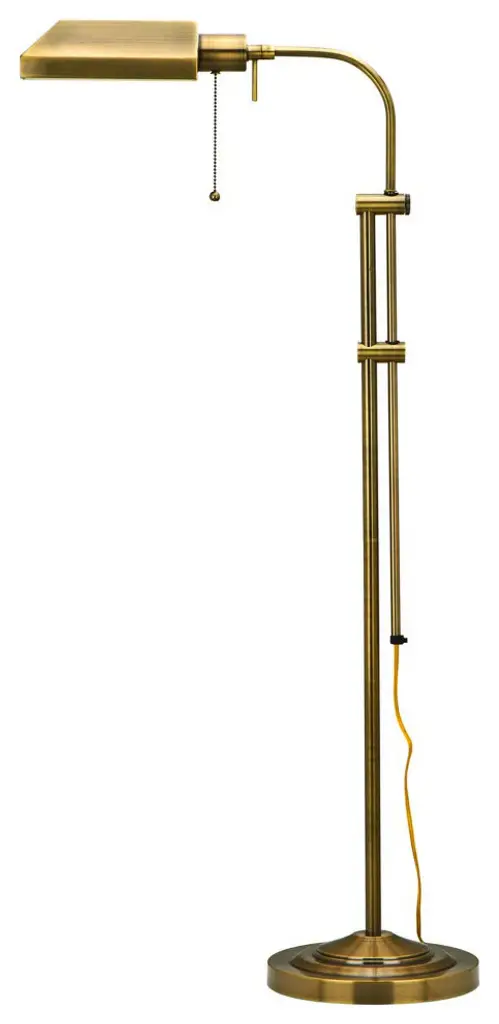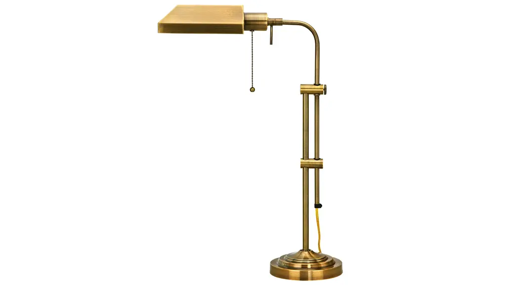 Increase the light on your work tables with this 60-watt pharmacy table lamp. The adjustable pole lets you raise or lower the light as needed, and the light comes with a hanging chain for easy control. Features:Care Instruction: Wipe clean with soft non abrasive clothBulb Base: E27Attaches: Pull chainStyle: PHARMACYNumber of Light: 1 LightBulb Wattage: 60 WLighting Type: Table LampProduct Features: Height AdjustableMaterial: MetalLighting Finish: Antique BrassSwitch Type: Pull ChainLighting Style: TraditionalColor: GoldDimensions: 16 inches long x 7 inches wide x 26 inches high