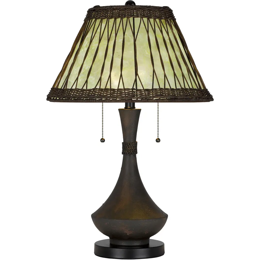 Add a tropical touch to your home with this dark bronze table lamp. It is constructed with durable resin and metal and features a painted green shade. It provides efficient lighting of 60 watts and has a unique wicker decorative trim.