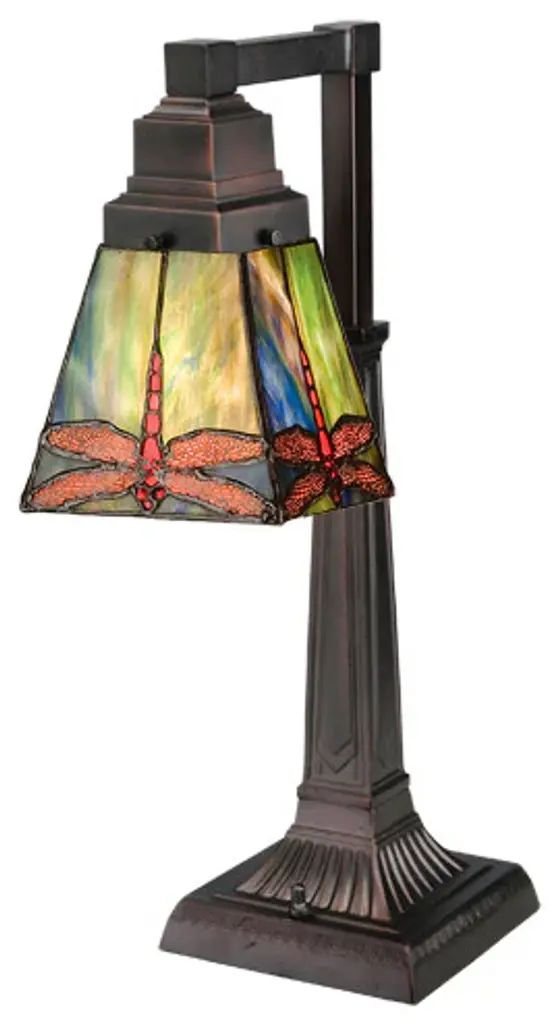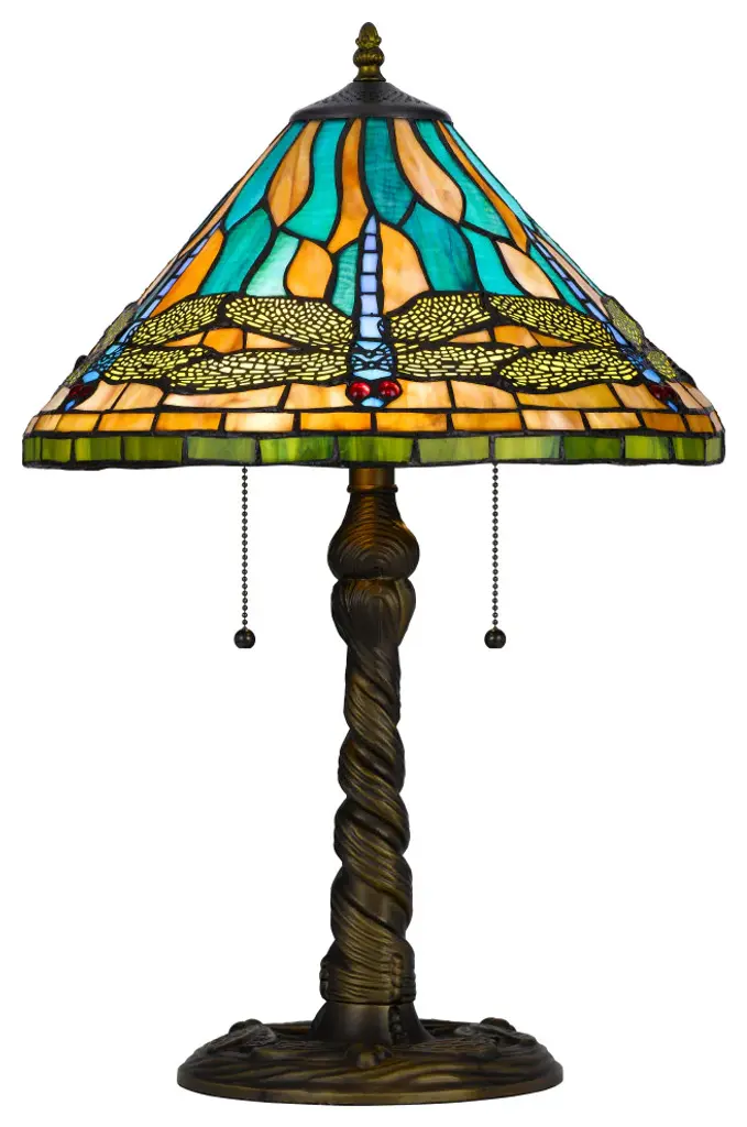 Add a pop of color to your home with this stained glass dragonfly tiffany table lamp. The lamp is constructed with durable resin and metal and features a hand-painted tiffany glass shade. It has a beautiful antique bronze finish and a pull chain switch.